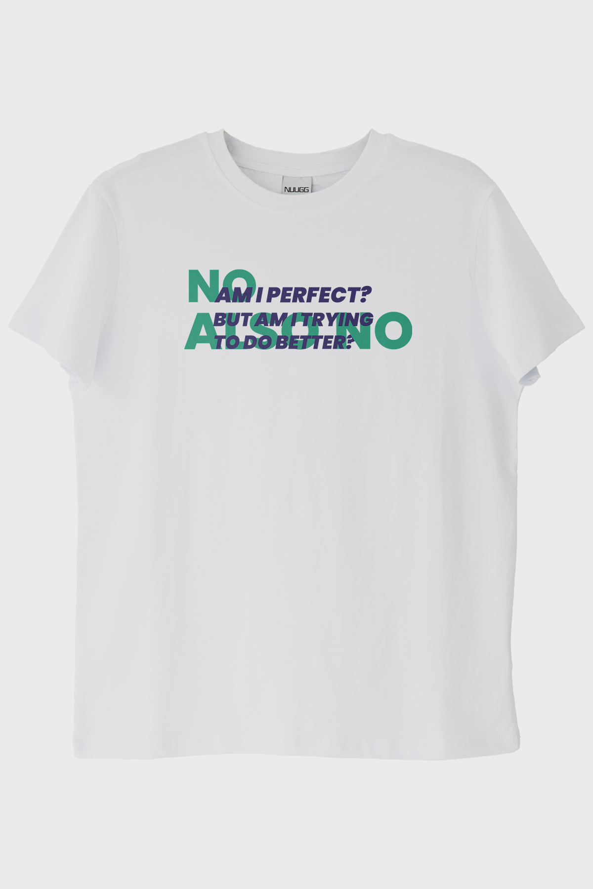 Am I Perfect But Trying tişörtü, günlük stilinize mizahi bir dokunuş katmak için ideal bir seçenektir. %100 pamuktan üretilen bu tişört, cilt dostu ve yüksek kalite baskı teknolojisi ile uzun ömürlü bir giyim deneyimi sunar. Tişörtün üzerinde yer alan baskıda, dikkat çekici yeşil ve mor renklerle kalın biçimde yerleştirilmiş 'NO' kelimesi dikkat çekiyor. Bu tasarım, 'Am I Perfect? But Am I Trying to Do Better?' yazısıyla birleşerek, kişisel gelişim ve mükemmellik üzerine esprili bir sorgulama yaratıyor. Mavi renkli yazıların dinamik yerleşimi, tişörtü modern ve anlamlı bir hale getiriyor.
