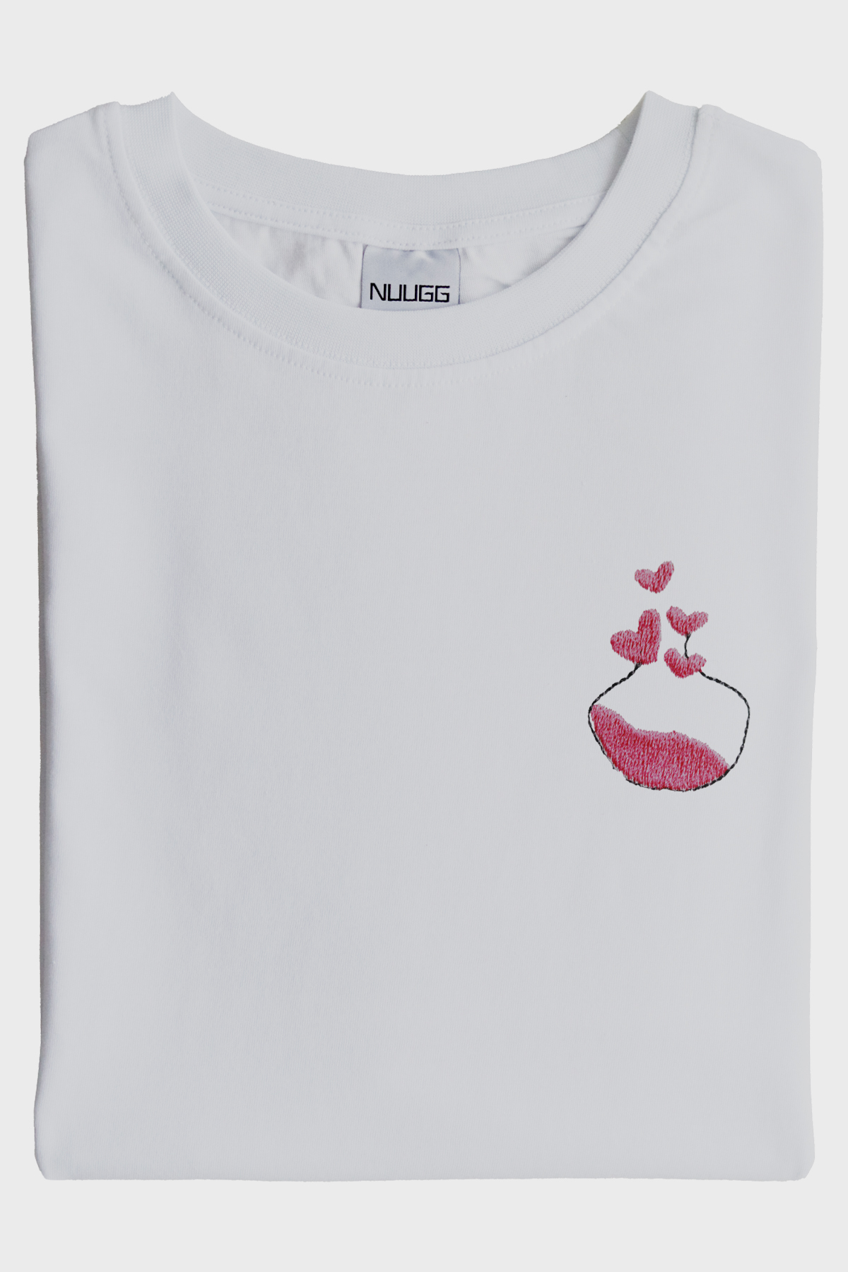 Aşk İksiri desenli nakış tişört, Sevgililer Günü için özel olarak tasarlanmış romantik ve anlam dolu bir üründür. Sol göğüs kısmında, siyah bir çerçeve ile işlenmiş bir iksir şişesi yer almaktadır. Şişenin iç kısmında pembe sıvı yer almakta ve sıvının üzerindeki kapaktan çıkan kalp şeklindeki detaylar, aşkı simgeler. Tişörtün arka kısmı sade bırakılmış, minimal bir tasarım sunar. %100 pamuk kumaşla üretilmiş olan bu tişört, konforlu ve şık bir giyim deneyimi sunar.