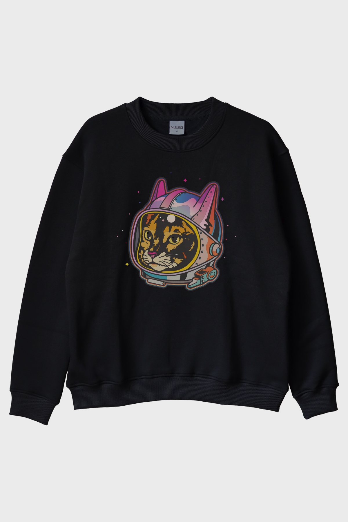 Astrocat Renkli Astronot Kedi Baskılı Bisiklet Yaka Sweatshirt, tamamen siyah bir zemin üzerine tasarlanmış dikkat çekici ve eşsiz bir üründür. Kedi illüstrasyonu, astronot kaskı içinde canlandırılmış ve pembe, mavi, mor tonlarıyla zarif bir şekilde renklendirilmiştir. Bisiklet Yaka Sweatshirtün merkezinde yer alan kedi, ciddi ifadesiyle uzay temasını eğlenceli bir şekilde yansıtırken, arka planda küçük yıldızlar evrene olan ilgiyi arttırıyor.