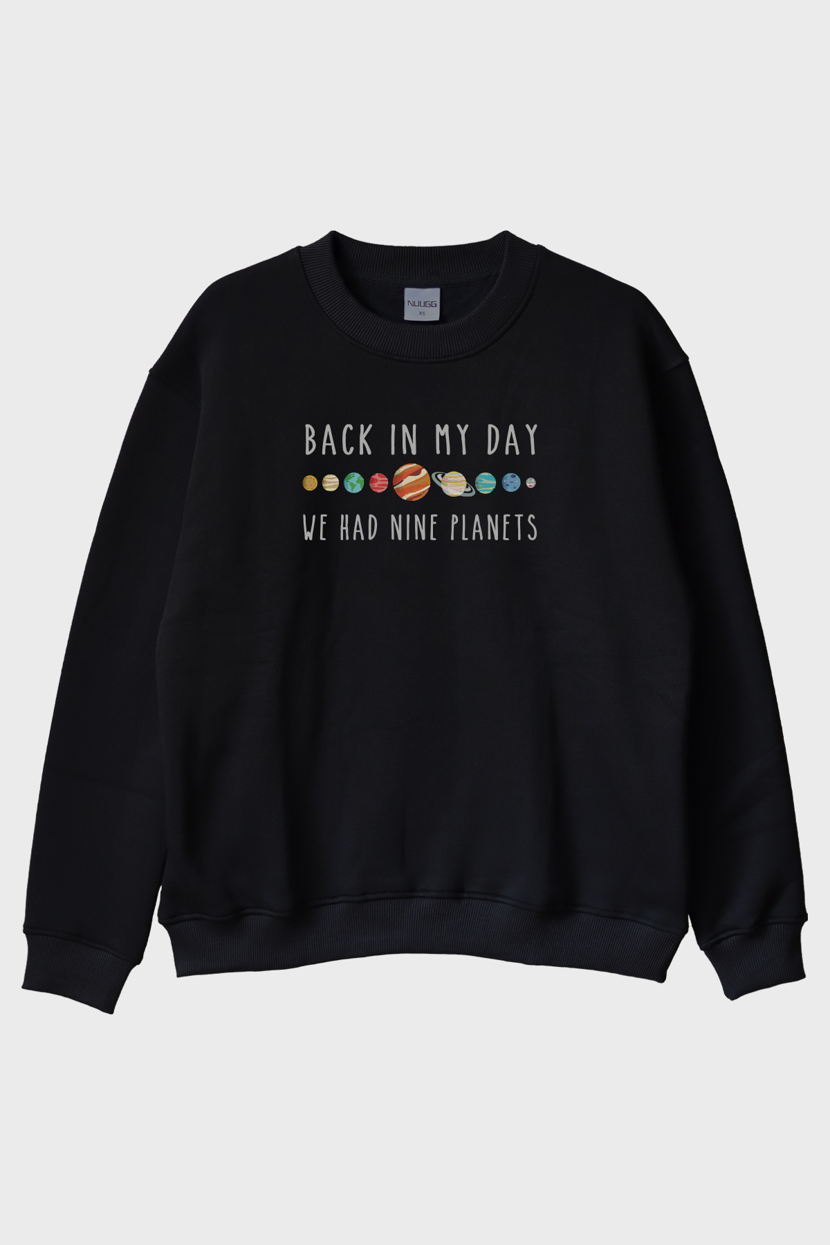 Evrene olan hayranlığınızı ve nostaljinizi bir arada yansıtacak bu tasarım harikası bisiklet yaka sweatshirt ile tanışın! "Back in My Day We Had Nine Planets" sloganlı baskısı ile dikkat çeken bu bisiklet yaka sweatshirt, hem esprili hem de nostaljik bir mesaj veriyor.