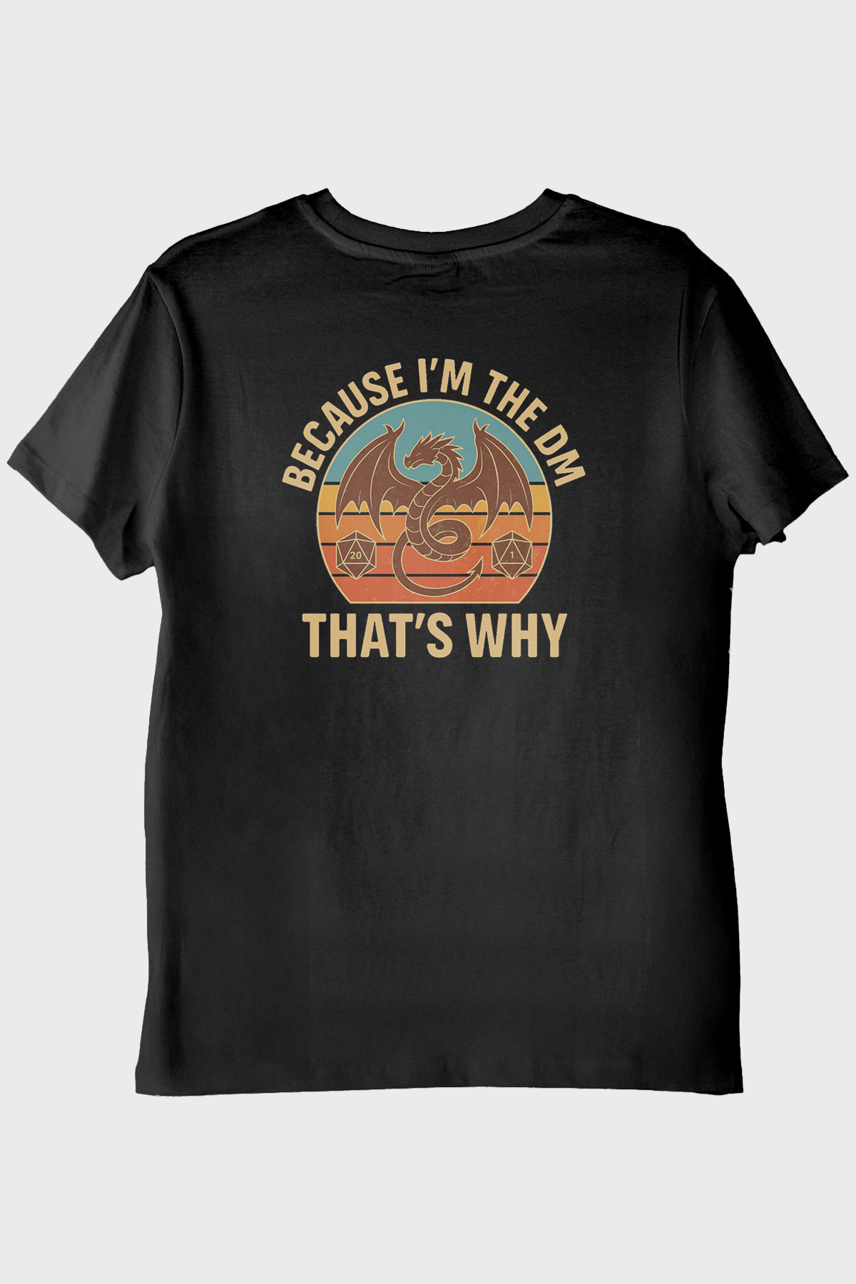 Tişörtün tasarımı beyaz zemin üzerine yerleştirilmiş olup, arka planda vintage tarzda sarı ve turuncu tonları kullanılmıştır. Üst kısımda yer alan 'BECAUSE I'M THE DM' yazısı ve altındaki 'THAT'S WHY' ifadesi, mizahi bir dokunuş katarak oynamayı sevenler için ilgi çekici bir unsur oluşturur. Bu eşsiz tasarım, Bilim ve Teknoloji meraklısı olanları da kendine çeker.