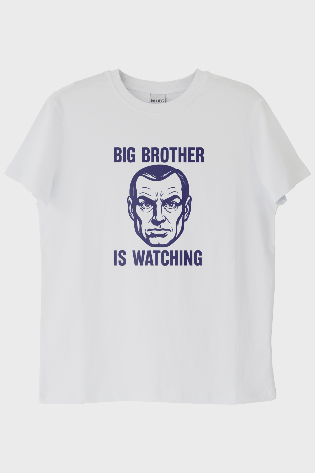 Distopik bir dünyaya gönderme yapan "Big Brother is Watching" baskılı tişört, siyah zemin üzerine büyük beyaz harflerle dikkat çekiyor. Ortadaki stilize edilmiş erkek yüzü tasviri, gözetim ve kontrol kavramlarını güçlendiren gri ve mavi tonlarıyla işlenmiştir. Tasarım sencillik ve etkileyiciliği bir araya getirerek hem günlük giyim için hem de özel konsept partilerde çarpıcı bir seçenek sunar.