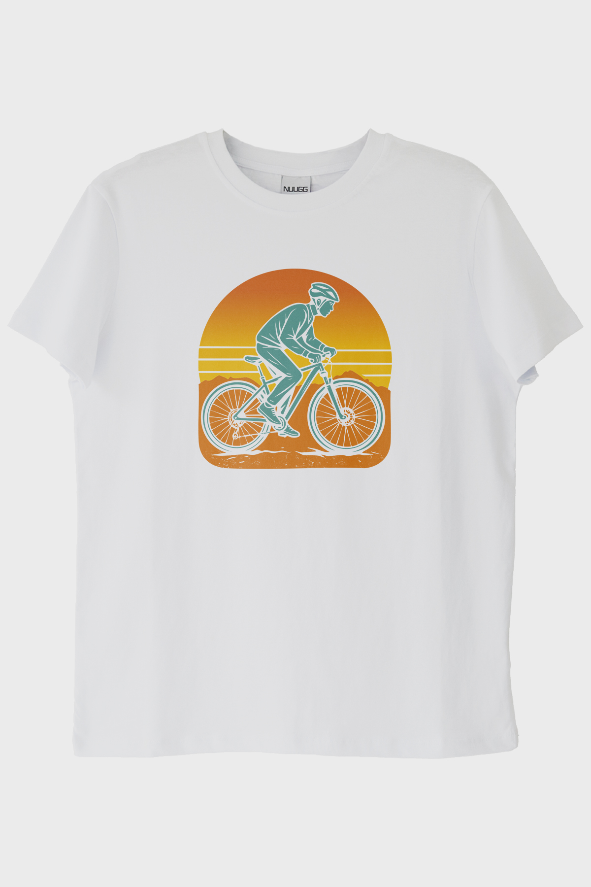 Göğüs kısmına yerleştirilmiş baskı, turuncu ve sarı tonlarında bir arka plan üzerine oluşturulmuş bisiklet süren figürü ile dikkat çeker. Yumuşak geçişli renk paleti, gün batımını çağrıştırarak tasarıma sıcak bir hava katıyor. Tişörtün genel rengi olan beyaz, baskının ön plana çıkmasını sağlar. Sadelik ve etkileyici renk kombinasyonu sayesinde gündelik kullanımlar için mükemmel bir seçimdir.