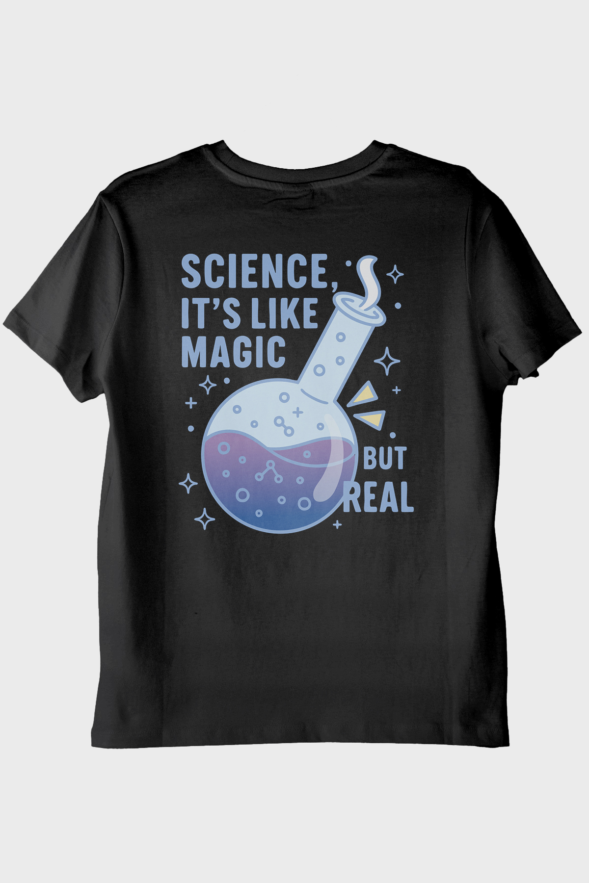 Bilimin büyülü dünyasını eğlenceli bir dille anlatan "Bilim ve Sihirin Eğlenceli Buluşması Tişört" tasarımında, bir laboratuvar şişesi etrafında parlayan yıldızlar göze çarpıyor. Üzerinde "Science, it's like magic but real" yazısı ile tişört, hem bilim hem de sihir tutkunları için harika bir seçenek sunuyor. Tasarımıyla gençlere ve bilim meraklılarına hitap eden bu tişört, giyildiğinde adeta bir konudan diğerine büyüleyici bir geçiş yapma hissi uyandırıyor. Bilime olan ilginizi giyiminizle yansıtırken aynı zamanda sihrin gizemli dokunuşunu da hissetmek isteyenler için özel olarak tasarlandı.