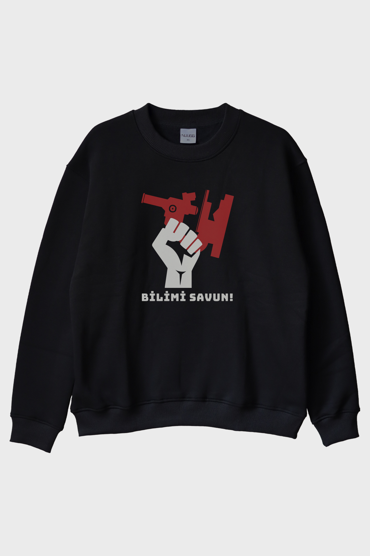 Modern bilim ve endüstrinin birleştirildiği eşsiz bir tasarım sunan "Bilimi Savun!" baskılı bisiklet yaka sweatshirt, stiline anlam katmak isteyenler için mükemmel bir tercih. Bu özel bisiklet yaka sweatshirt, siyah zemin üzerinde dikkat çekici kırmızı ve gri grafiklerle tasarlanmıştır, merkezinde ise bilim ve teknolojiyi simgeleyen mikroskop ve dişli çark motifleri yer alır. Tasarımın ortasındaki güçlü yumruk simgesi, T Shirt stillerine güçlü bir ifadeyle katkı sağlıyor.