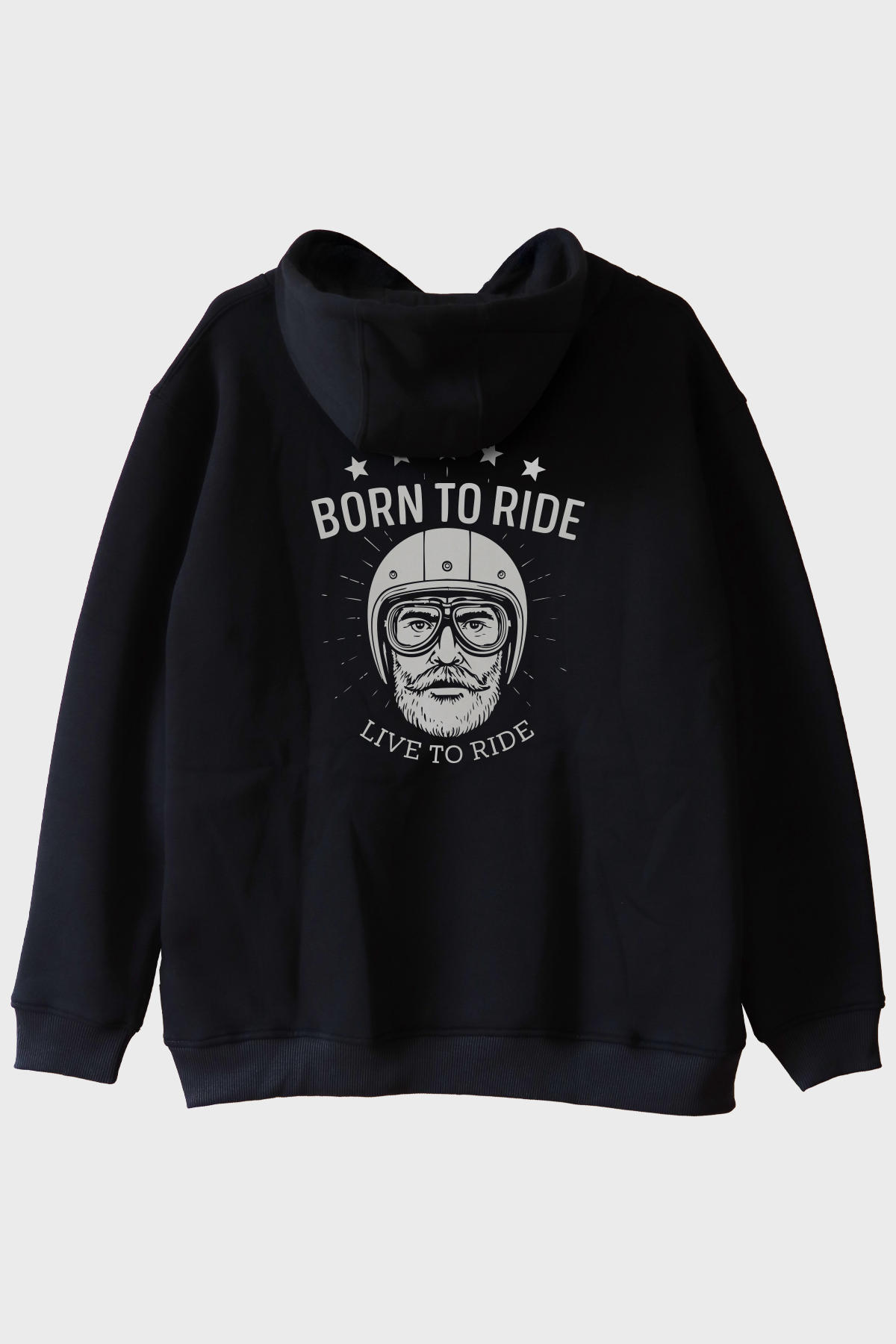 Bu özel tasarım hoodie, motosiklet tutkusunu üzerinde taşımak isteyenler için ideal. Siyah zemin üzerinde yer alan etkileyici 'BORN TO RIDE' ve 'LIVE TO RIDE' sloganları, hem stil sahibi hem de anlam dolu bir görünüm sunuyor. Hoodieün ön bölümündeki yaşlı adam figürü, motosiklet kaskı ve gözlükle bir araya getirilmiş olup, özgürlüğü ve macerayı simgeliyor.