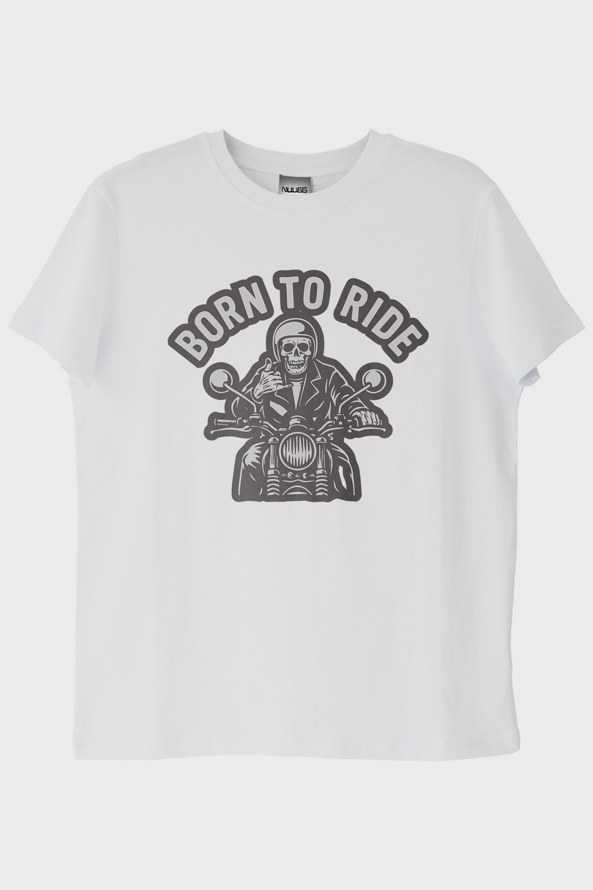 Özgür ruhunuza hitap eden bu tişört, 'BORN TO RIDE' sloganıyla macera tutkunuzu yansıtıyor. Kasklı iskelet figürü, detaylı bir şekilde çizilmiş olup, güçlü bir motor üzerindeki duruşuyla dikkatleri üzerine çekiyor. Bu baskılı tişört, siyah rengin şıklığını ve beyaz baskının kontrastını mükemmel bir şekilde birleştiriyor.