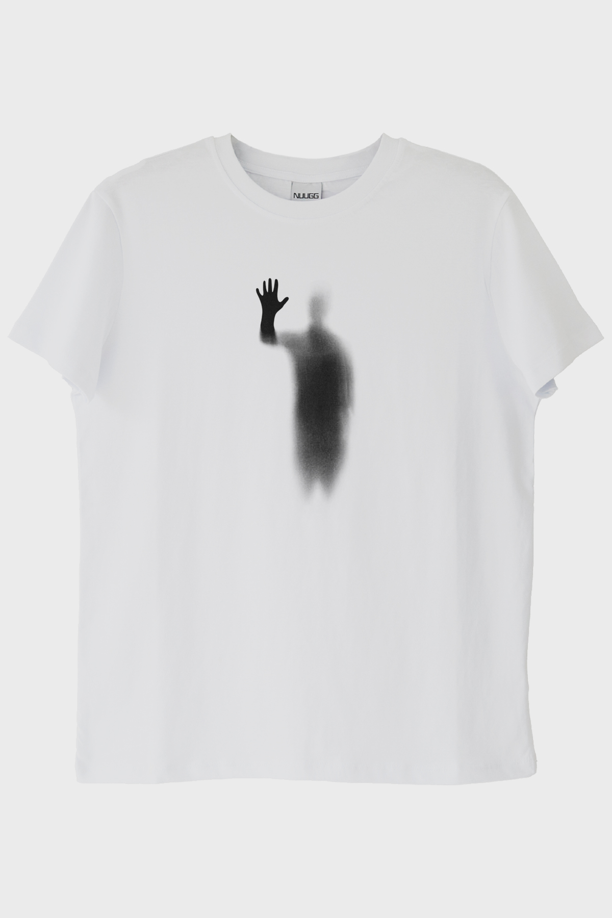 Bu dikkat çekici siyah tişört, göğüs kısmında bulanık bir şekilde arkadan aydınlatılmış elini kaldırmış bir silueti tasvir eden baskısıyla, gizemli ve sofistike bir tarz sunuyor. Minimalist bir tasarım anlayışıyla oluşturulan bu tişört, siyah ve beyazın mükemmel kontrastıyla göz kamaştırıyor. Paranormal ya da gizemli figürü sayesinde, giymeyi tercih eden kişiye ilginç bir stil kazandırıyor.