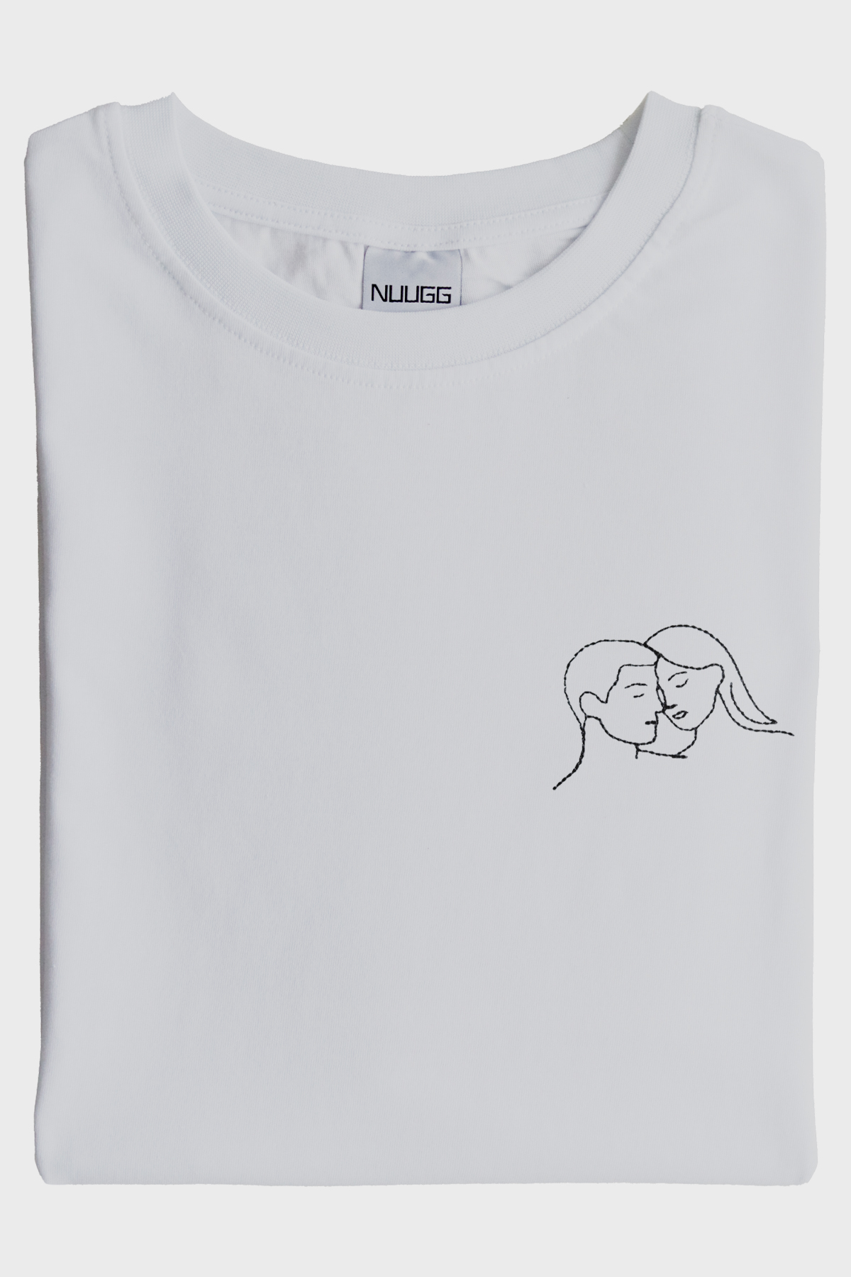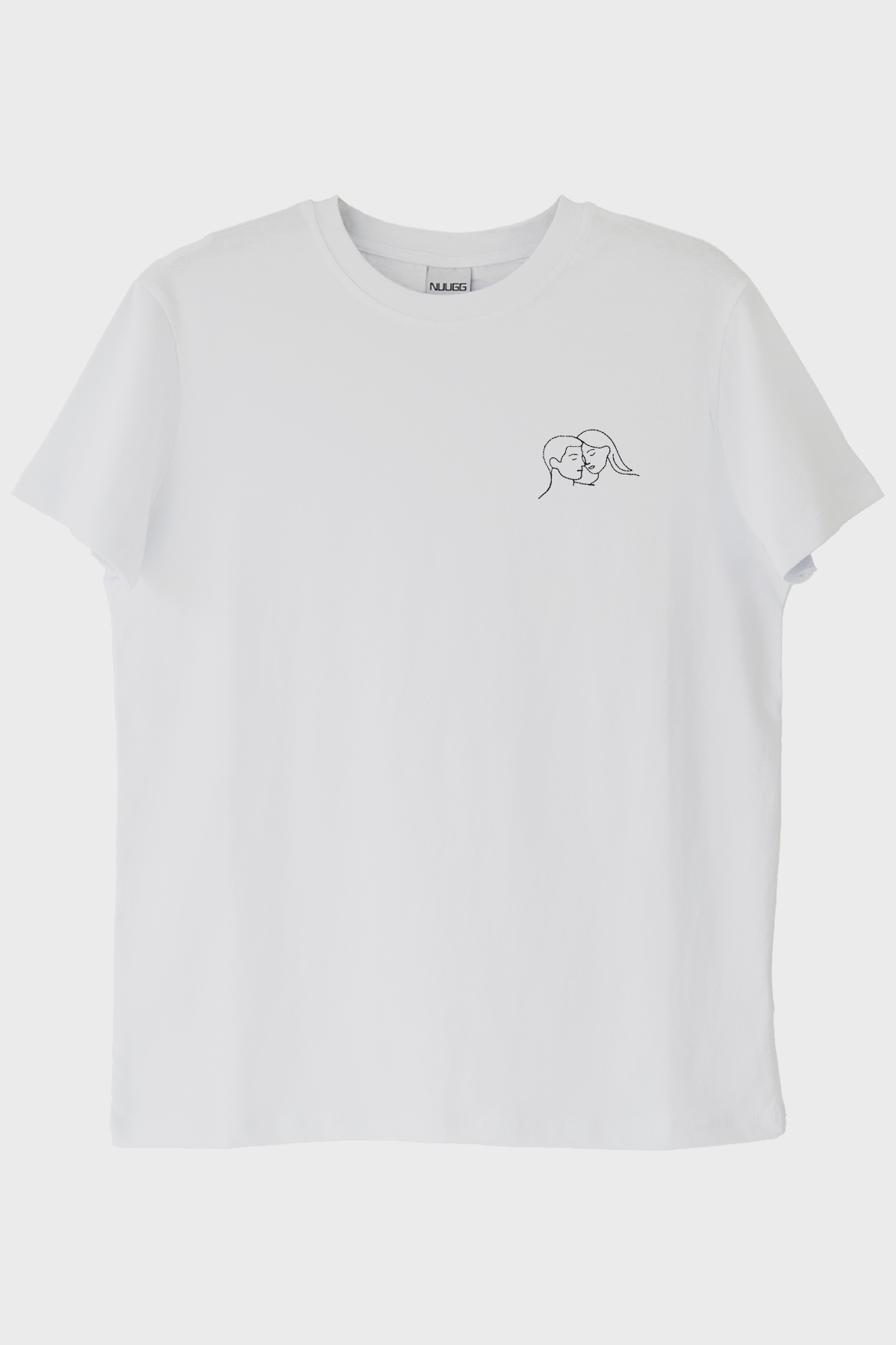 Bu tişört, birbirine kafalarını dayamış bir çift silüeti ile sevginin ve yakınlığın zarif bir sembolünü sunuyor. Sol göğüs kısmına işlenen bu silüet, romantizmin ve bağlılığın en güzel ifadesi olarak tasarlandı. Şıklığı ve anlamı bir arada taşıyan bu tasarım, Sevgililer Günü veya özel bir hediye için mükemmel bir seçim.