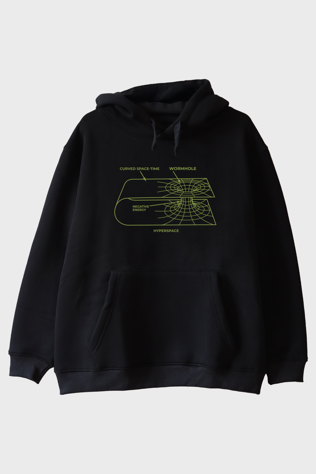 Bilimin büyüleyici dünyasına adım atmak isteyenler için tasarlanan Curved Space-Time Baskılı Solucan Deliği Hoodie, bilim ve teknoloji meraklıları için mükemmel bir seçim. Bu hoodieün ön yüzündeki soluk yeşil çizim, uzay-zaman kavramını ve solucan deliklerini bilimsel bir perspektif ile sizlere sunuyor. Çizim üzerinde "Curved Space-Time," "Wormhole," "Negative Energy," ve "Hyperspace" gibi bilimsel terimler yer almakta ve bu terimler, tasarımı hem eğitici hem de ilgi çekici kılmakta.