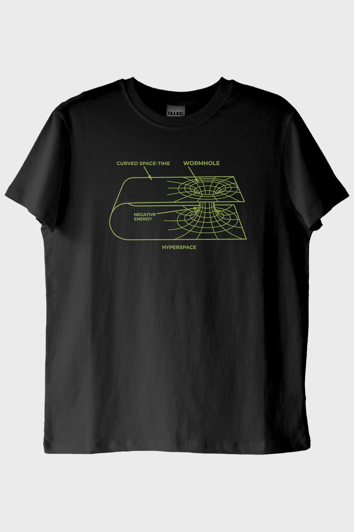 Bilimin büyüleyici dünyasına adım atmak isteyenler için tasarlanan Curved Space-Time Baskılı Solucan Deliği Tişört, bilim ve teknoloji meraklıları için mükemmel bir seçim. Bu tişörtün ön yüzündeki soluk yeşil çizim, uzay-zaman kavramını ve solucan deliklerini bilimsel bir perspektif ile sizlere sunuyor. Çizim üzerinde "Curved Space-Time," "Wormhole," "Negative Energy," ve "Hyperspace" gibi bilimsel terimler yer almakta ve bu terimler, tasarımı hem eğitici hem de ilgi çekici kılmakta.