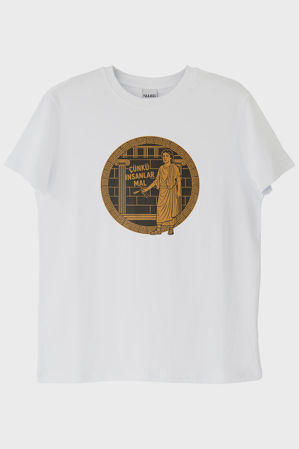 Felsefi Mizah ve Antik Yunan Esintili İronik Tişört, hem tarihe ve felsefeye olan ilginizi ortaya koyarken, hem de günlük hayatta esprili bir tavır sergilemenizi sağlıyor. Tişört üzerinde yer alan antik Yunan tarzı illüstrasyon ve içerisindeki ünlü bir filozof diamond tema figürü, sizi her baktığınızda düşüncelere daldıracak. Çerçeve içerisindeki 'Çünkü insanlar mal' ifadesi ise, mizahi bir unsur ekleyerek tişörtü bambaşka bir boyuta taşıyor. Hem esprili, hem de derin düşünen bir karaktere sahip olan sizler için bu tişört, tam da aradığınız parça olabilir. Her baktığınızda sizi güldürürken, aynı zamanda düşündüren bu özel tasarım, dolabınızda çok değerli bir yer edinecek.