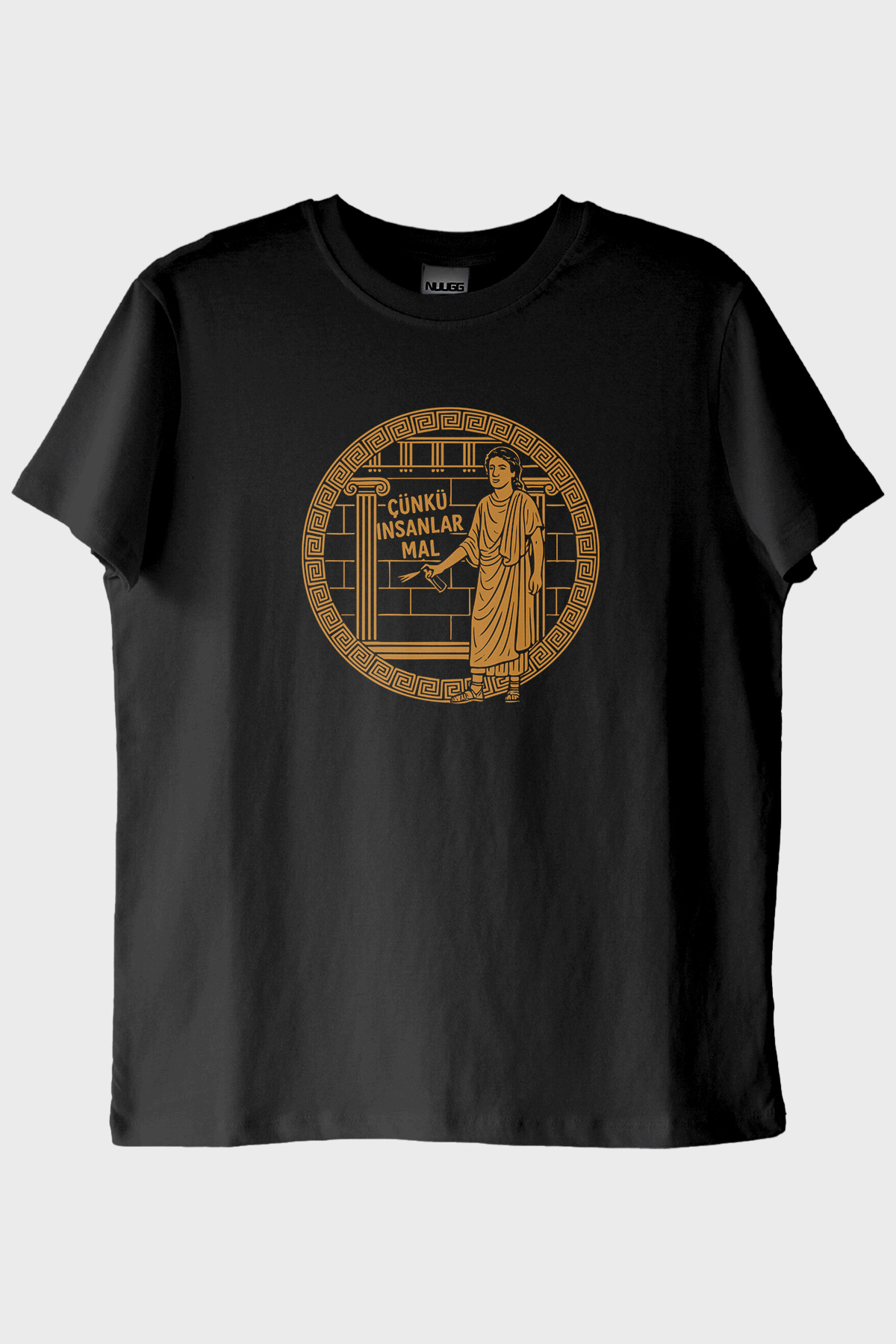 Felsefi Mizah ve Antik Yunan Esintili İronik Tişört, hem tarihe ve felsefeye olan ilginizi ortaya koyarken, hem de günlük hayatta esprili bir tavır sergilemenizi sağlıyor. Tişört üzerinde yer alan antik Yunan tarzı illüstrasyon ve içerisindeki ünlü bir filozof diamond tema figürü, sizi her baktığınızda düşüncelere daldıracak. Çerçeve içerisindeki 'Çünkü insanlar mal' ifadesi ise, mizahi bir unsur ekleyerek tişörtü bambaşka bir boyuta taşıyor. Hem esprili, hem de derin düşünen bir karaktere sahip olan sizler için bu tişört, tam da aradığınız parça olabilir. Her baktığınızda sizi güldürürken, aynı zamanda düşündüren bu özel tasarım, dolabınızda çok değerli bir yer edinecek.