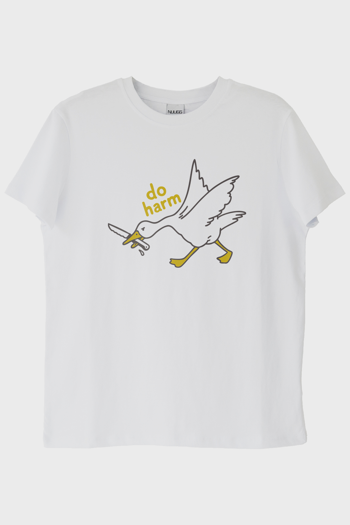 Günlük stilinizi farklı ve dikkat çekici kılmak için tasarlanan bu "Do Harm" konseptli kaz baskılı tişört, hem esprili hem de çarpıcı bir görünüm sunuyor. Tasarımın merkezinde yer alan siyah çizgili kaz, ağzında bir bıçak tutarken 'do harm' mesajıyla birlikte ironi ve mizahın en güzel örneklerinden birini sergiliyor. Sarı tonlarındaki bıçak ve yazı detayı, beyaz zemin üzerinde kontrast yaratırken, bu baskılı tişört tişört koleksiyonunuzu benzersiz bir şekilde tamamlıyor.