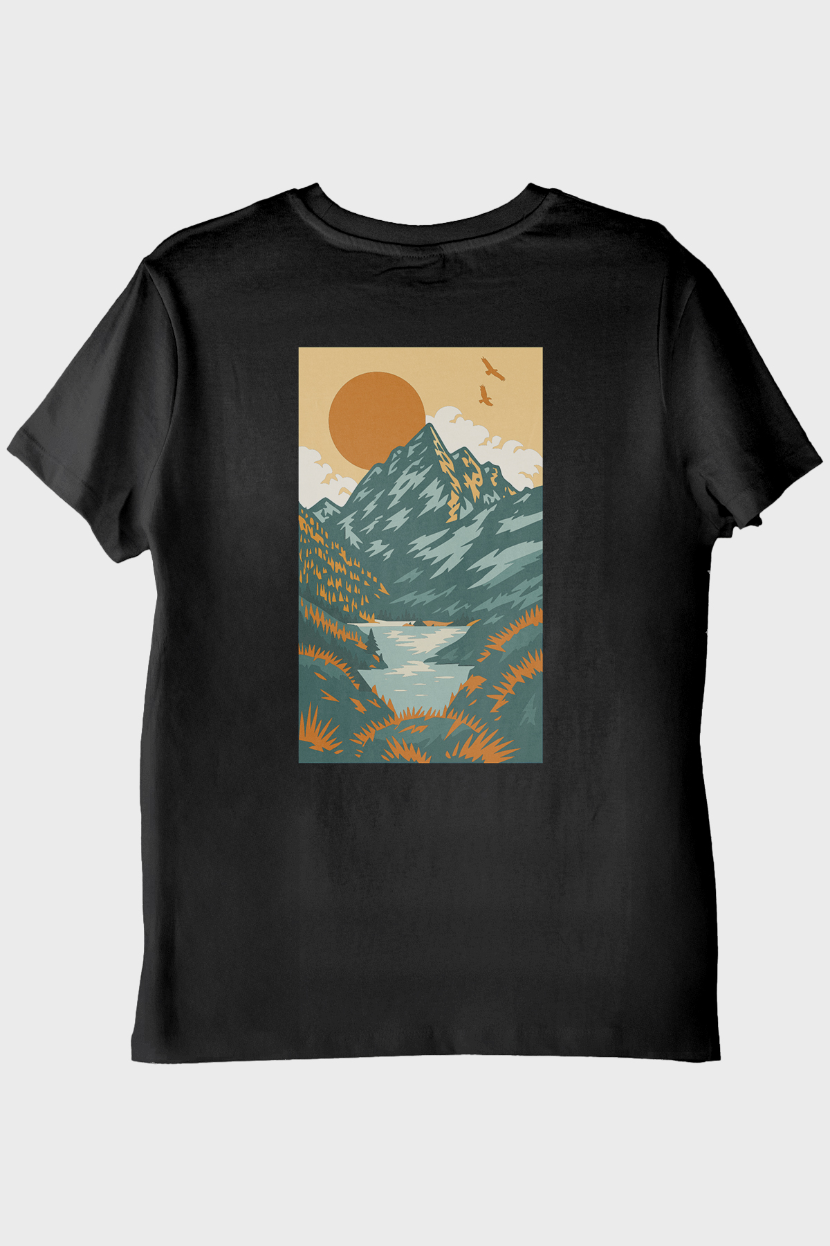 Doğa Manzaralı Turuncu Güneşli Baskılı Tişört