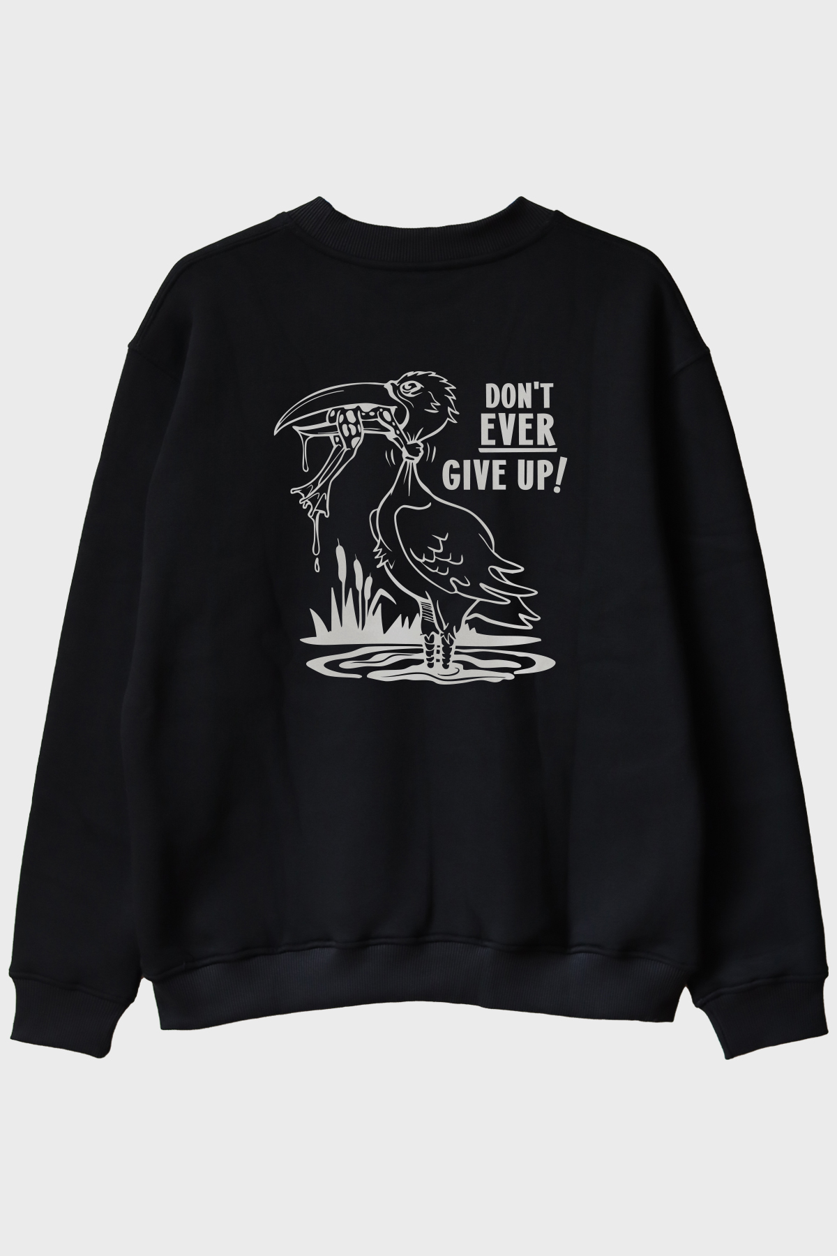 Bu eşsiz tasarım bisiklet yaka sweatshirt, siyah zemin üzerine beyaz baskı ile üretilmiştir ve göğsünde etkileyici bir illüstrasyon bulunmaktadır. İllüstrasyonda, büyük bir kuş başka bir hayvanı yutmaya çalışırken, o hayvan kuşun boynunu tutarak mücadeleyi bırakmaz. Yan tarafında ise, "DON'T EVER GIVE UP!" şeklinde cesaret verici bir mesaj yer almaktadır. Bu tasarım mizahi bir anlayışa sahip olup, cesur bir duruş sergilemek isteyenlere hitap etmektedir. Bisiklet Yaka Sweatshirt %66 pamuktan üretilmiş olup, yerli üretim kaliteli baskı tekniği kullanılarak üretilmiştir. Cilt dostu malzeme ile uzun ömürlü bir kullanıma sahiptir.