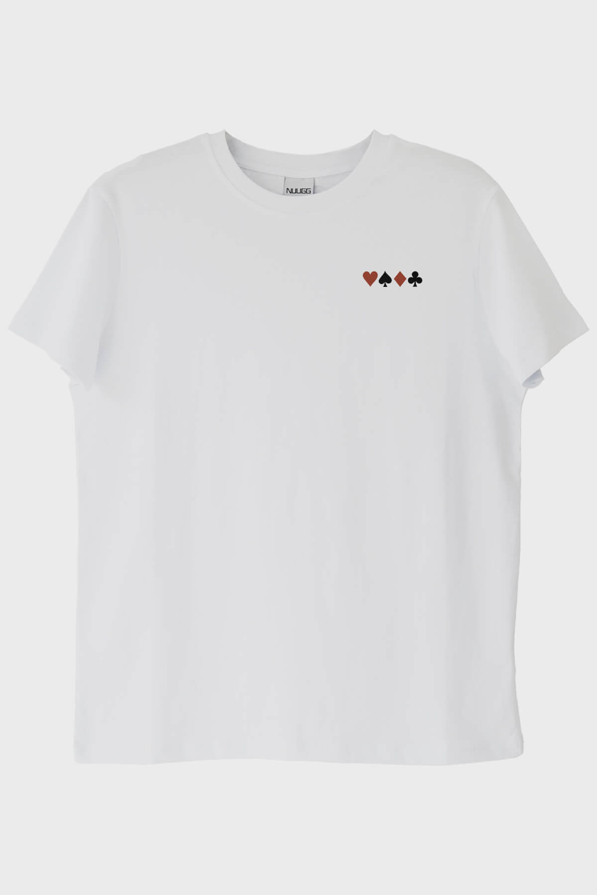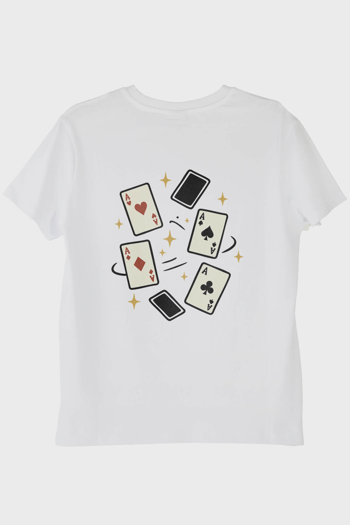 Giyiminizle şansınızı üst seviyeye taşımaya hazır mısınız? Dörtlü As Figürlü Tişört, klasik iskambil kağıdı sembollerini şıklıkla buluşturarak zarif bir tasarım sunuyor. Maça, kupa, karo ve sinek figürlerinin minimalist bir yaklaşımla tişört üzerinde yer alması, bu tasarımı kart oyunlarına veya şans oyunlarına ilgi duyanlar için mükemmel hale getiriyor. Bu benzersiz tasarım, gündelik kullanımda size şıklık katan bir ürün olarak gardırobunuzda vazgeçilmez bir parça olacak. Her biri dikkatlice düşünülen bu figürler, günlük tarzınıza zarafet katarken, aynı zamanda detaylara ne denli önem verdiğinizin de altını çizecek. Dörtlü As Figürlü tasarım, Mert Çınar koleksiyonunda yer alan diğer ürünlerle dikkat çekici bir bütünlük sağlayacak.