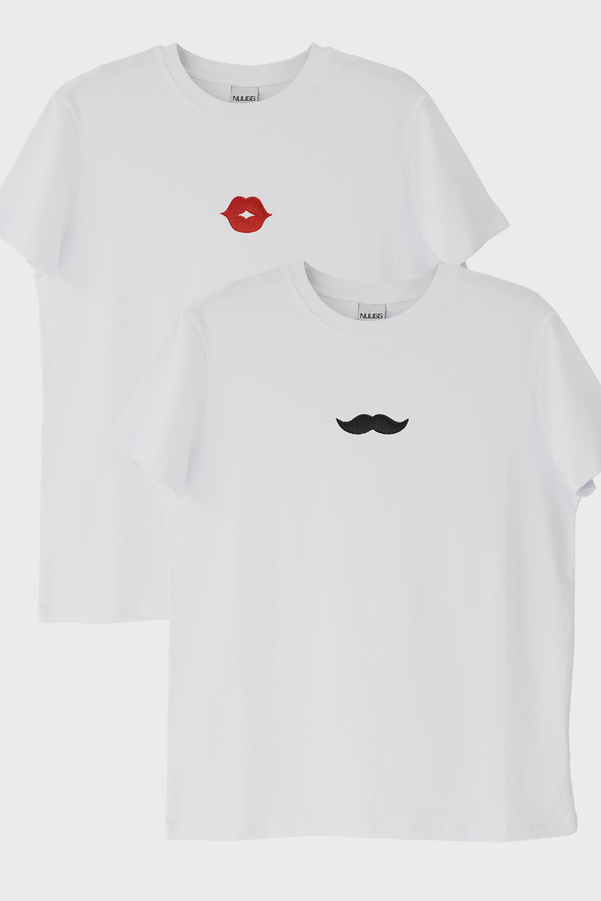 Set, beyaz renkte dudak desenli bir tişört ve siyah renkte bıyık desenli bir tişörtten oluşur. Her iki model de %100 pamuklu kumaştan üretilmiş olup, cilt dostu yapısı sayesinde gün boyu rahat bir kullanım sağlar. Kullanılan nakış desenler ise yüksek kaliteli ipliklerden yapılmıştır ve dayanıklıdır.