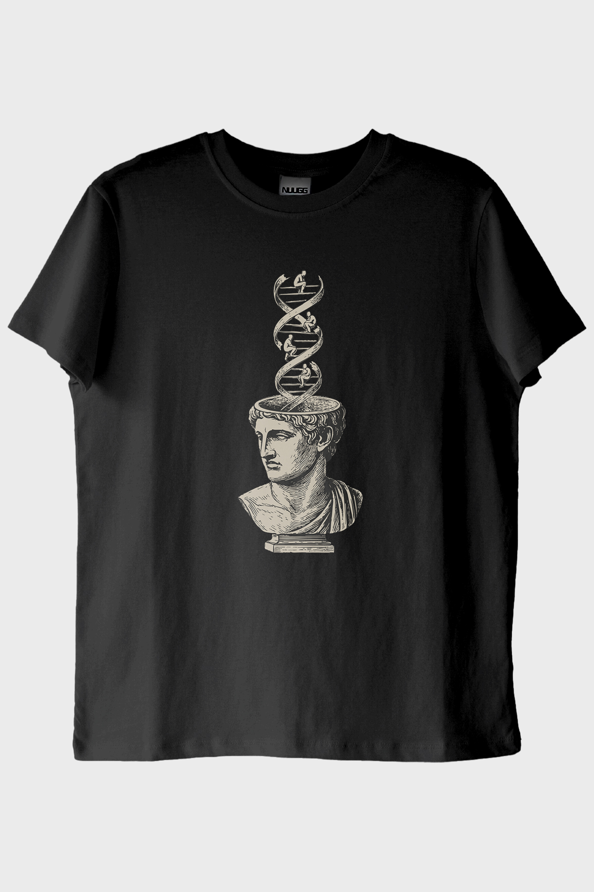 Bu eşsiz tişört, her detayında entelektüel bir derinliği ve zarafeti barındırıyor. Tasarımı, antik bir heykel başından çıkan DNA sarmalını görselleştirerek bilimin sanatla iç içe geçmişliğini gözler önüne seriyor. Minimalist bir yaklaşımla dizayn edilen bu tişört, hem şıklığı hem de bilimsel temaya olan sadakati ile dikkat çeker. Antik dönem izlerinden ilham alırken, modern çağın bilimsel buluşlarıyla harmanlanan tişört, giyen kişiye hem sanatsal hem de bilimsel bir ifade kazandırıyor. Bu eşsiz tasarım, benzersiz bir giyim deneyimi sunarak sanatla bilimi gardırobunuza taşıyor.