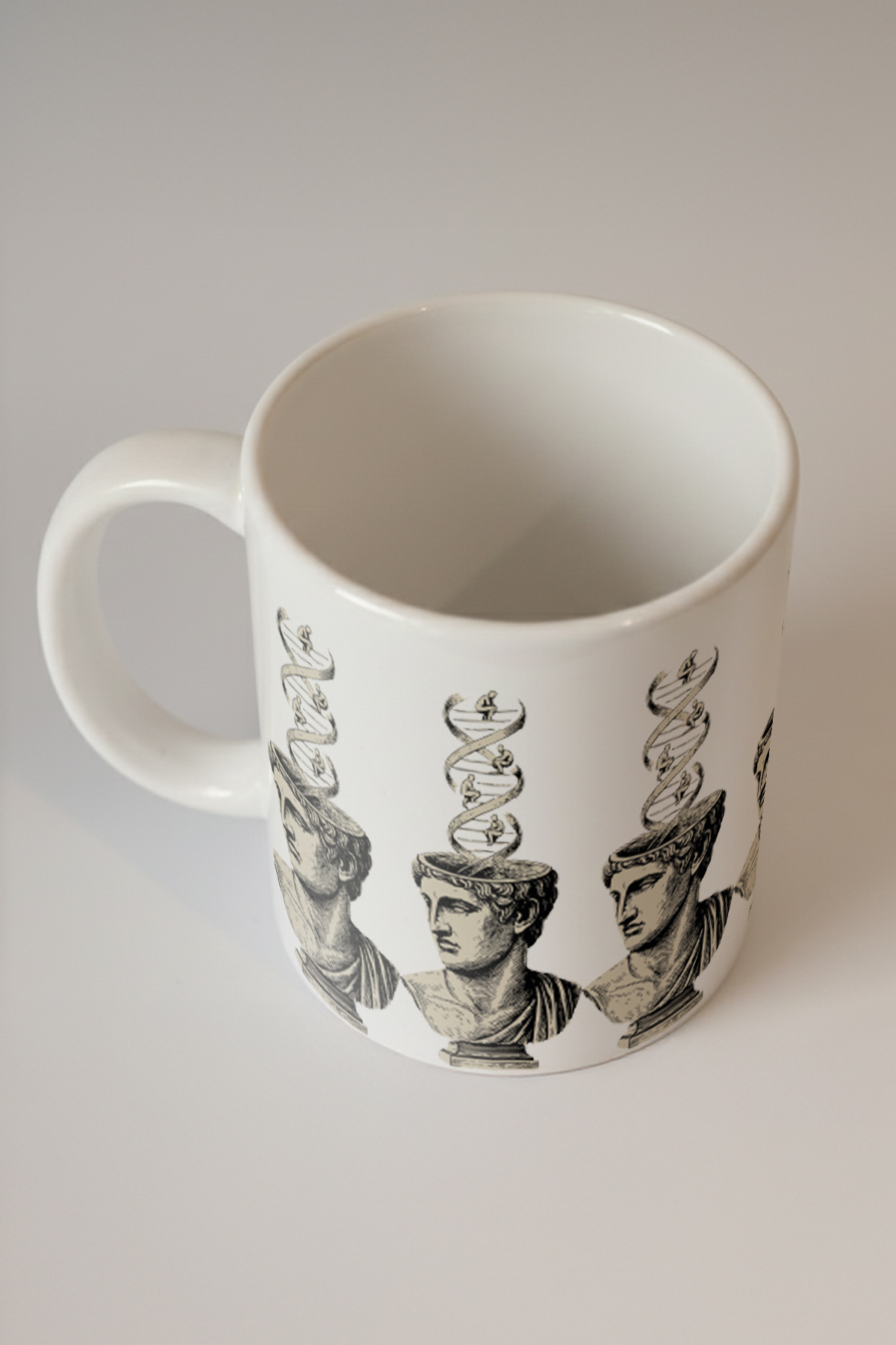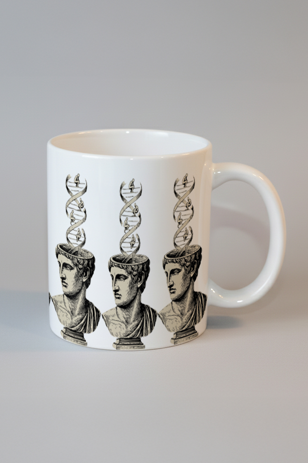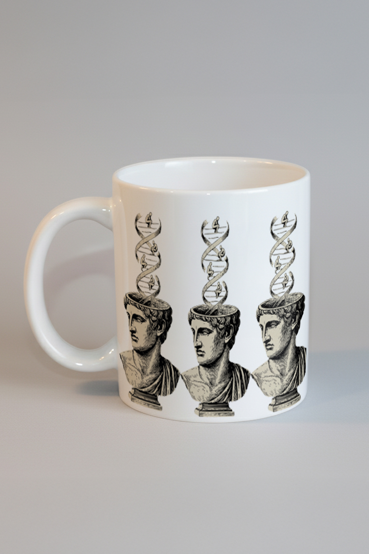Tasarımın iç içe geçtiği bu sanat eserinde, antik heykel büstlerinin üstünde yer alan DNA sarmalları ile düşünce yapısının derinliklerine yolculuk yapmaya hazır olun. Hem tarihsel dokunuşları hem de bilimsel unsurları bir araya getiren tasarım, geçmiş ve bugünü tek bir obje üzerinde buluşturuyor. DNA sarmalları, düşüncenin yapısını ve evrimin temel taşlarını simgelerken, antik büstler tarihin derinlerinden günümüze mesaj taşıyor. Retroverse temalı tasarımı ile geçmişin izlerini günümüzün modern anlayışıyla birleştiriyor; böylece, hem tarih meraklılarına hem de biyoloji tutkunlarına hitap ediyor. Bu tasarımla, kahvenizi yudumlarken aynı zamanda derin düşüncelere dalabilirsiniz.