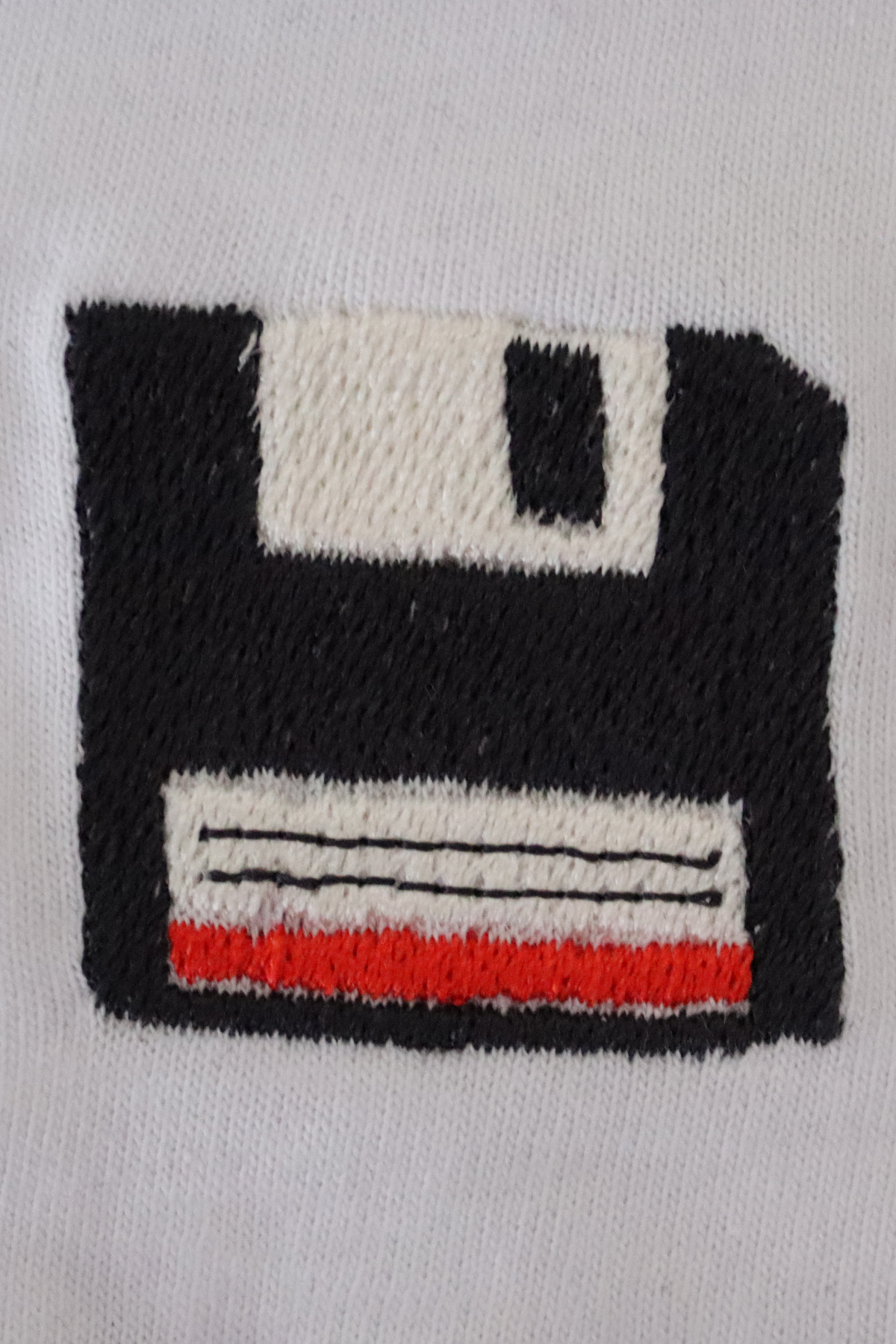 Teknolojinin altın çağını simgeleyen disketler, şimdi stilinize nostaljik bir hava katıyor! Disket desenli nakış tişört, geçmişin en ikonik veri saklama cihazlarından birini taşıyan tasarımıyla retro ve teknoloji tutkunları için harika bir seçenek sunuyor.
