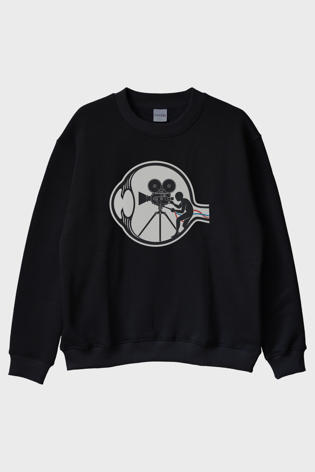 Estetik ve sinema tutkunları için özel olarak tasarlanmış bu baskılı bisiklet yaka sweatshirt, göz alıcı bir estetik sunar. Beyaz zemin üzerinde bulunan bu grafik tasarım, dikkat çekici detaylarıyla ön plana çıkmaktadır. Göğüs kısmında yer alan eski tip film kamerasını çalıştıran insan figürü, tasarıma nostaljik bir hava katmaktadır.
