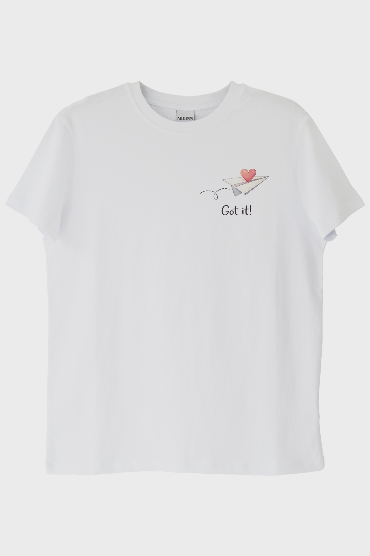 Minimalist ve etkili bir tasarıma sahip olan 'Got it!' tişört, sevgi ve mesaj temalı detaylarıyla her yaştan insanın kalbini kazanmaya aday. Tasarımında küçük bir kağıttan uçak ve kalp detayları bulunan bu giysi, hayatın küçük ancak anlamlı sevinçlerini yansıtıyor. Üzerindeki "Got it!" yazısı ile pozitif bir mesaj iletmek için ideal, günlük yaşamda enerjik ve samimi bir görünüm sunuyor. Her yaştan kişiye hitap eden bu tasarım, giyenin duygusal dünyasına hoş bir dokunuş katıyor. Birçok kişinin kalbini çalacak bu ürün, günlük stilinizin vazgeçilmezi olacak.