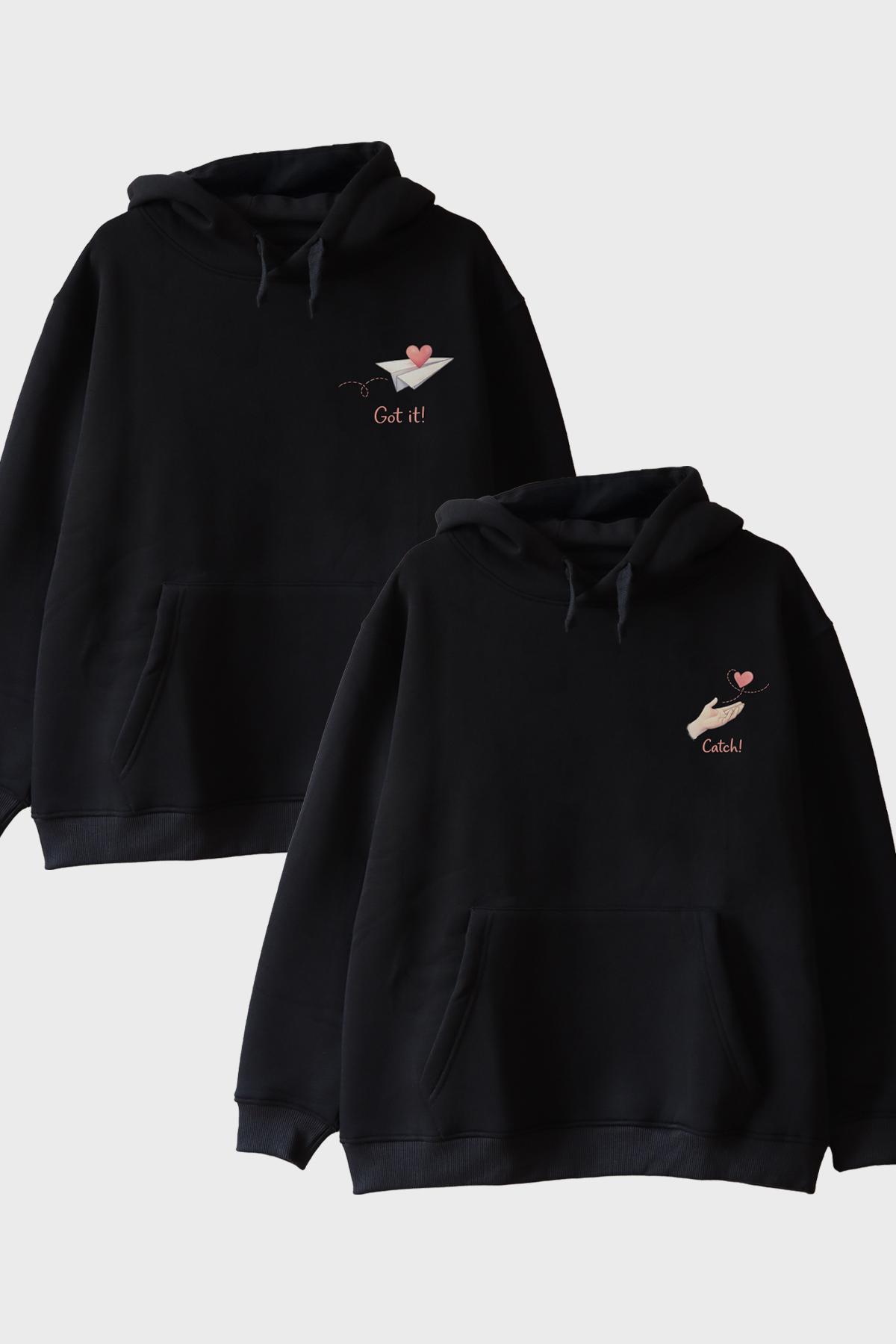 Got it-Catch Hoodie tasarımını incelerken, göğüs bölgesine yerleştirilmiş iki dikkat çekici figür hemen göze çarpıyor. İlk tasarımda, kağıt uçak üzerinde bir kalp figürüyle "Got it!" ifadesi yer alıyor. Bu simge, sevginin hafifliğini ve masumiyetini yansıtırken, aynı zamanda bir mesajı da iletiyor: Sevgiyi yakalamak cesaret ister. Diğer tasarımda ise el ve kalp figürüyle "Catch!" ifadesi dikkat çekerken, karşıdan gelen bir sevginin sıcak bir şekilde karşılanışını temsil ediyor. Her iki tasarım da son derece romantik ve eğlenceli bir yaklaşımla, günlük hayata optimizm katıyor.