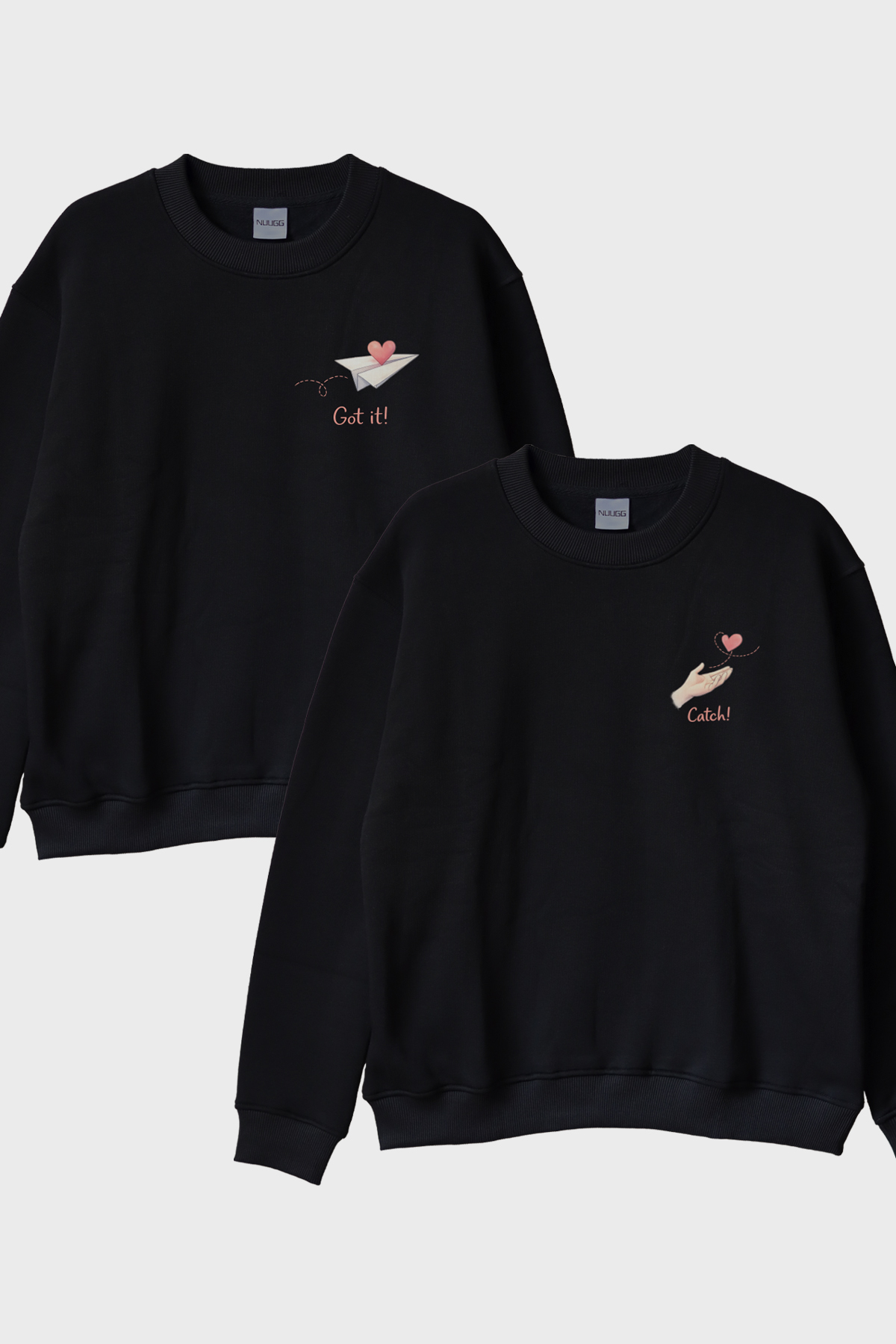 Got it-Catch Bisiklet Yaka Sweatshirt tasarımını incelerken, göğüs bölgesine yerleştirilmiş iki dikkat çekici figür hemen göze çarpıyor. İlk tasarımda, kağıt uçak üzerinde bir kalp figürüyle "Got it!" ifadesi yer alıyor. Bu simge, sevginin hafifliğini ve masumiyetini yansıtırken, aynı zamanda bir mesajı da iletiyor: Sevgiyi yakalamak cesaret ister. Diğer tasarımda ise el ve kalp figürüyle "Catch!" ifadesi dikkat çekerken, karşıdan gelen bir sevginin sıcak bir şekilde karşılanışını temsil ediyor. Her iki tasarım da son derece romantik ve eğlenceli bir yaklaşımla, günlük hayata optimizm katıyor.