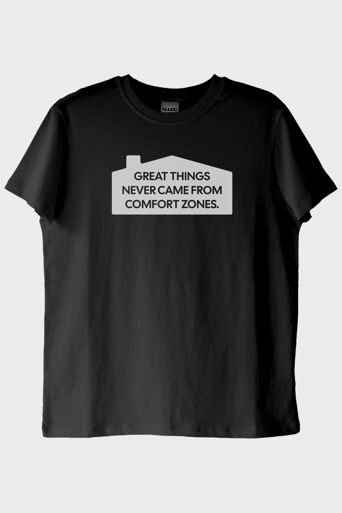 Tasarımında motivasyonel bir mesaj barındıran bu tişört, konfor alanınızın dışına çıkmanın ne kadar önemli olduğunu vurgular. Minimal ve modern bir tarza sahip olan bu tişört, sade ve temiz bir yazı tipi ile desteklenmiştir. %100 pamuktan üretilmiş olup, cilt dostu ve uzun ömürlü kullanıma uygundur. Kaliteli baskı tekniği sayesinde uzun süreli kullanımlarda bile baskısında solma yaşanmaz.
