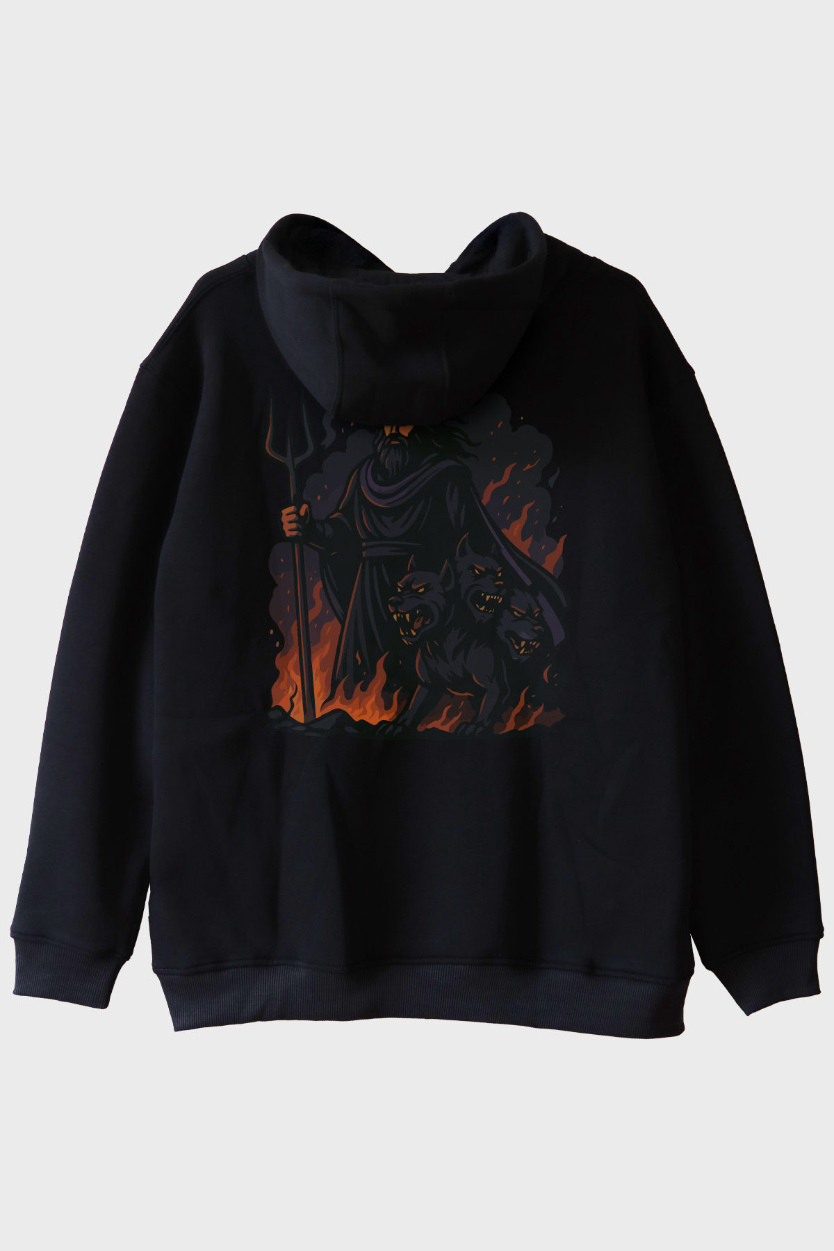 Mitolojik öykülerin derinliklerinden ilham alan bu eşsiz hoodie, sizi antik dönemlerin karanlık ama büyüleyici dünyasına davet ediyor. Tasarımda, yeraltı dünyasının kudretli tanrısı Hades, onun sadık, üç başlı köpeği Cerberus ile birlikte zarif ve sanatsal biçimde tasvir edilmiştir. Koyu renk tonları, tasarımın mistik temasını vurgulayarak, adeta her adımda size bir parça mitolojinin gücünü hissettiriyor. Hades ve Cerberus figürü, benzersiz detaylarla zenginleştirilmiş, bu da giysinizi adeta bir sanat eserine dönüştürüyor. Mitolojinin ve sanatın ustaca harmanlandığı bu tasarım, farklı ve dikkat çekici bir stil arayanlar için ideal bir seçim.