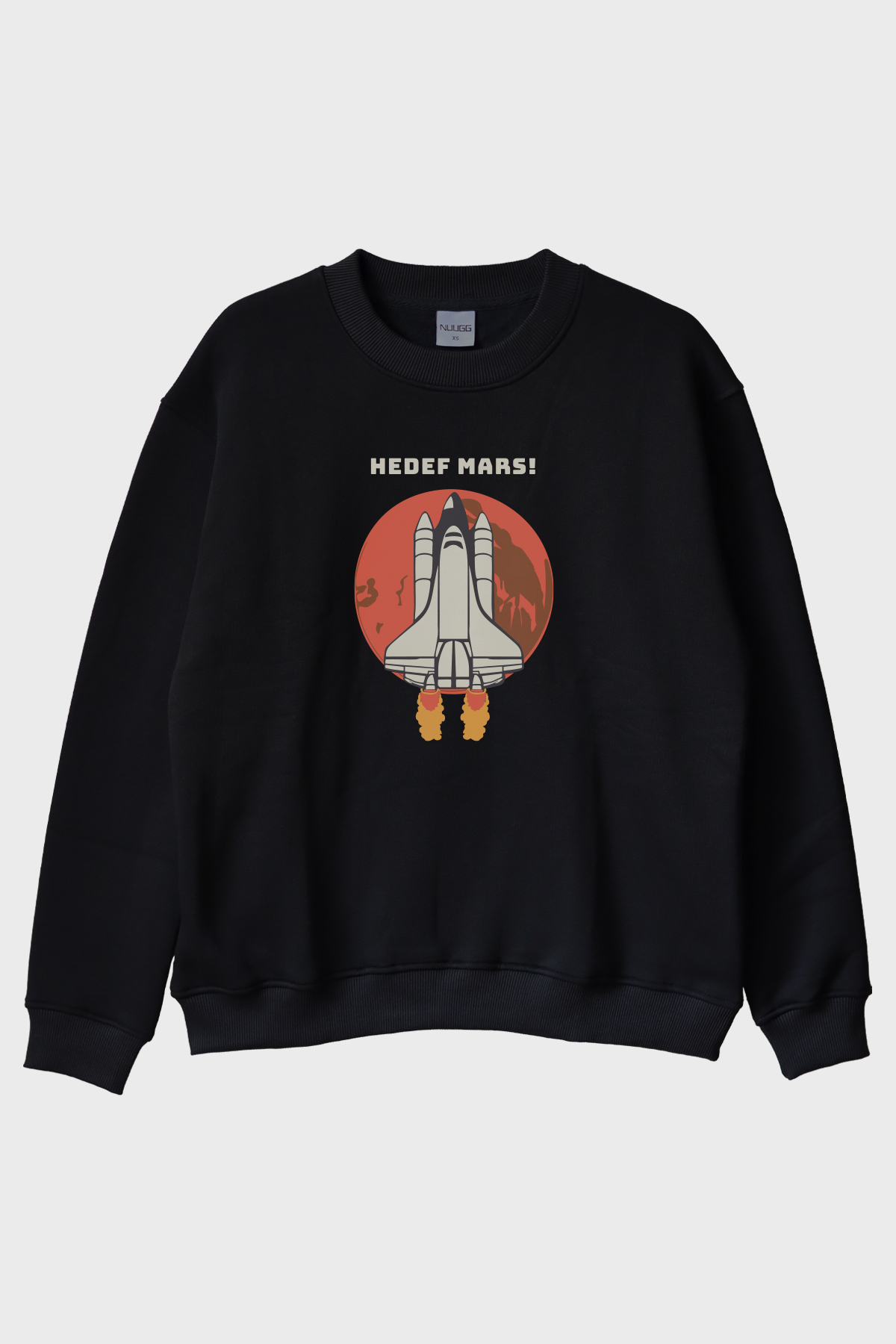 Uzay ve bilim tutkunları için özel olarak tasarlanan "HEDEF MARS!" baskılı bu bisiklet yaka sweatshirt, ön yüzünde yer alan roket ve kırmızı gezegen Mars görseli ile dikkat çekiyor. Tasarımın üst kısmında büyük harflerle yazılmış "HEDEF MARS!" ifadesi sayesinde güçlü ve dinamik bir vurgu yapılmıştır. Özellikle roketin altından çıkan alev efektleri, bisiklet yaka sweatshirte hareket kazandırıyor.