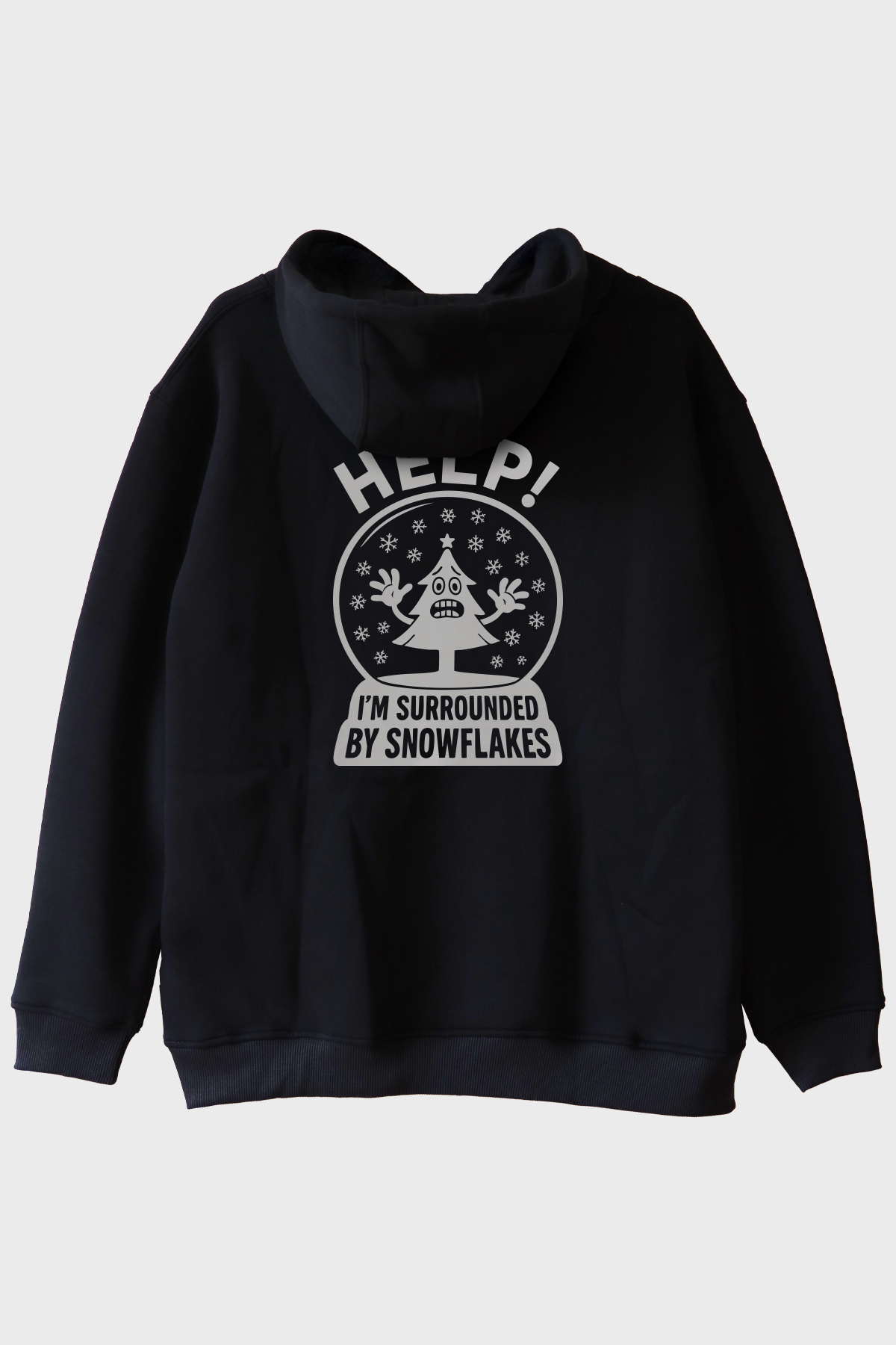 Moda ve mizahın birleştiği bu baskılı hoodie, gardırobunuzda fark yaratacak bir parça. Beyaz zemin üzerine tasarlanan bu Hoodie, kar küresi içinde yardım isteyen ağaç figürüyle dikkat çekiyor. Tasarımın üst kısmında yer alan "Help!" ifadesi ve altındaki "I'm Surrounded by Snowflakes" metni ile esprili ve ironik bir mesaj taşıyor.