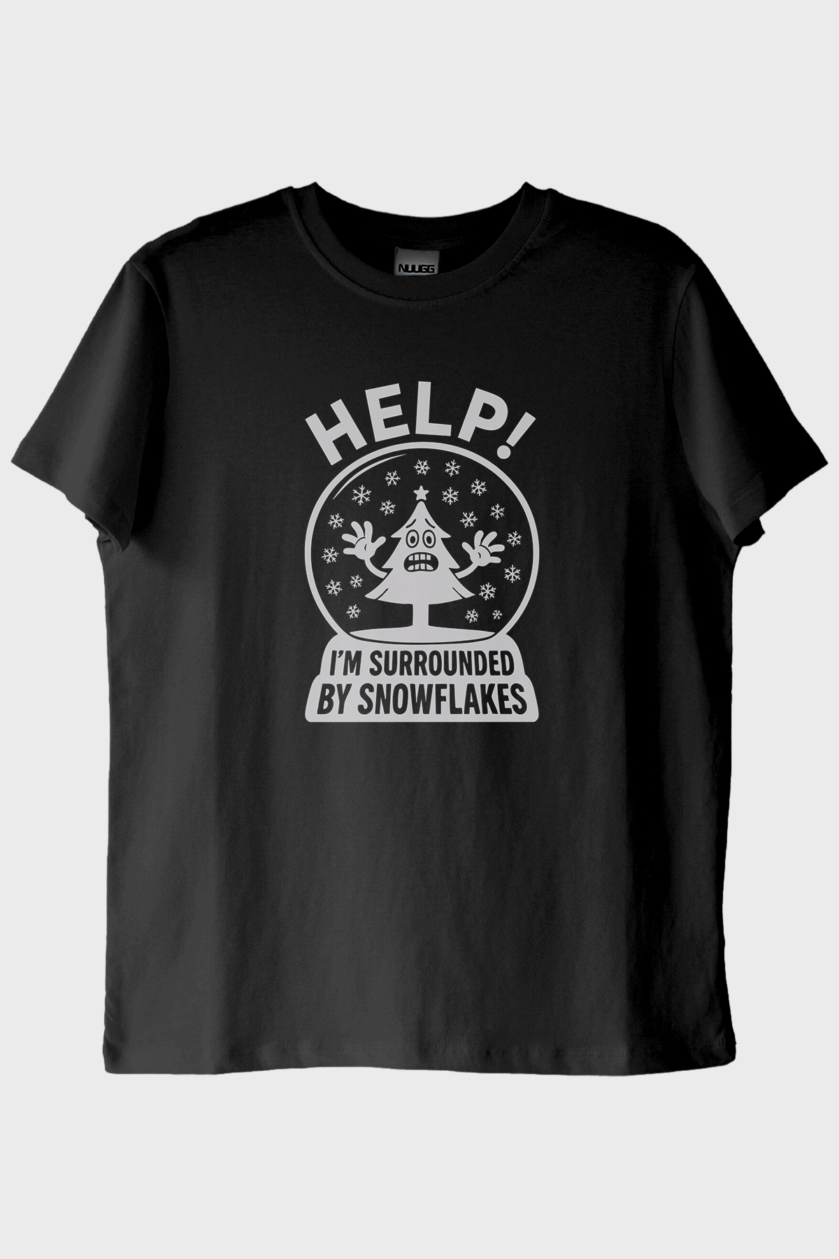 Moda ve mizahın birleştiği bu baskılı tişört, gardırobunuzda fark yaratacak bir parça. Beyaz zemin üzerine tasarlanan bu T-Shirt, kar küresi içinde yardım isteyen ağaç figürüyle dikkat çekiyor. Tasarımın üst kısmında yer alan "Help!" ifadesi ve altındaki "I'm Surrounded by Snowflakes" metni ile esprili ve ironik bir mesaj taşıyor.
