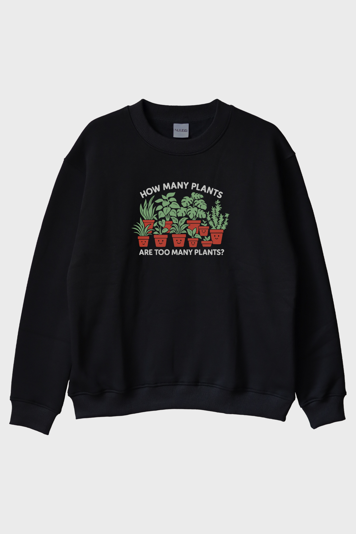 Tasarım dünyasını mizahi bir dille bir araya getiren bu eşsiz bisiklet yaka sweatshirt, bitki severlerin ilgisini çekecek nitelikte. Üzerinde 'HOW MANY PLANTS ARE TOO MANY PLANTS?' yazısı ve çeşitli saksılarda tasvir edilen farklı bitki desenleri bulunmaktadır. Kırmızı tonlarındaki sevimli saksılar, yeşil tonlarda hayat bulan bitkilerle birleştiğinde, siyah arka planın üzerinde etkileyici bir kontrast oluşturur.