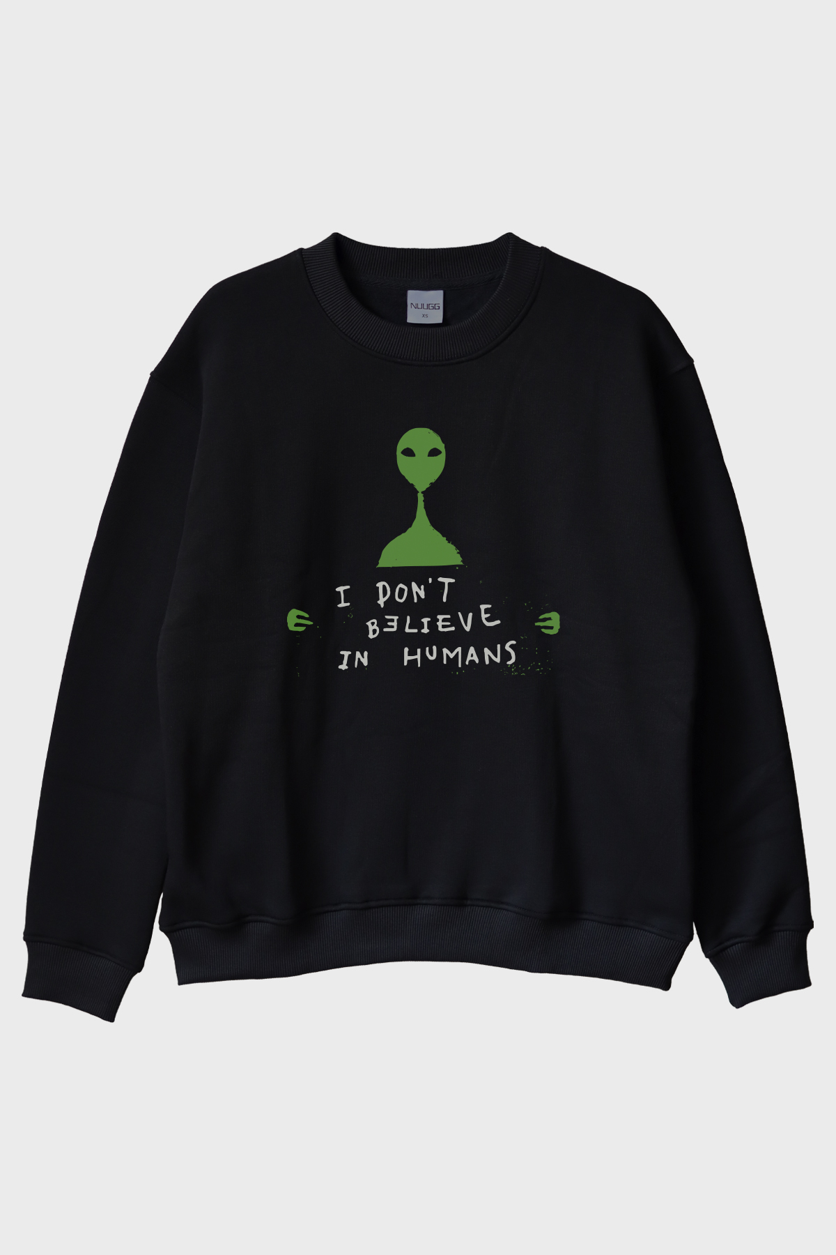 “I Don’t Believe in Humans” sloganlı bu bisiklet yaka sweatshirt, uzaylı figürüyle geek ruhunuza hitap ediyor. Baskıda kullanılan canlı renkler ve detaylı nakış işçiliği, ürüne hem modern hem de dikkat çekici bir hava katıyor. Günlük stilinize mizah ve özgünlük katacak bu tasarım, arkadaş toplantılarından oyun gecelerine kadar her ortamda üstünüzden çıkarmak isteyeceğiniz bir parça olacak.