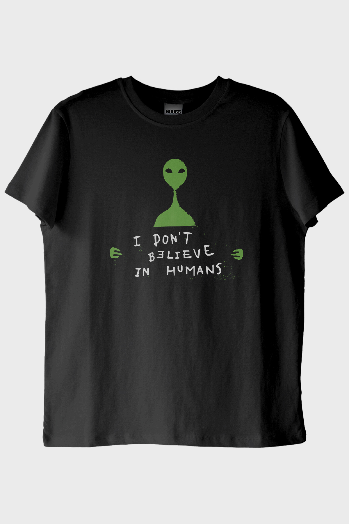 • Desen: Uzaylı figürü & “I Don’t Believe in Humans” sloganı