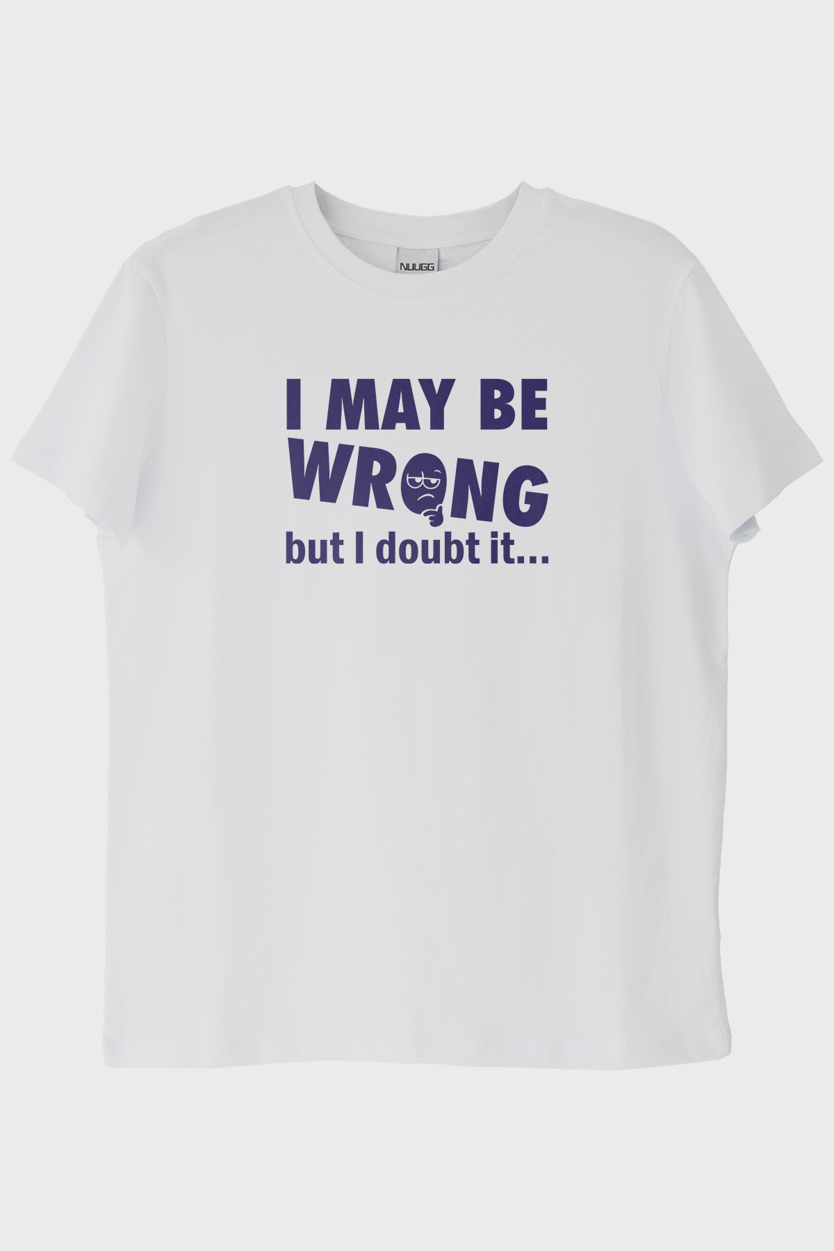 Bu eşsiz T Shirt tasarımı, ön kısmına yerleştirilmiş dikkat çekici ve mizahi bir mesaj sunuyor: "I MAY BE WRONG but I doubt it...". Yazının klasik sans-serif font kullanımı ve kelimelerin farklı boyutlarda yazılması, tasarımın dikkat çekici olmasını sağlıyor. Özellikle "WRONG" kelimesinin büyük harflerle ve geniş bir fontla vurgulanması, tasarıma ekstra bir çekicilik katıyor. Bunun yanında, "O" harfinin yerine gözlüklü ve düşünceli bir yüz ifadesi eklenerek tasarımın mizahi ve eğlenceli yönü ön plana çıkıyor.