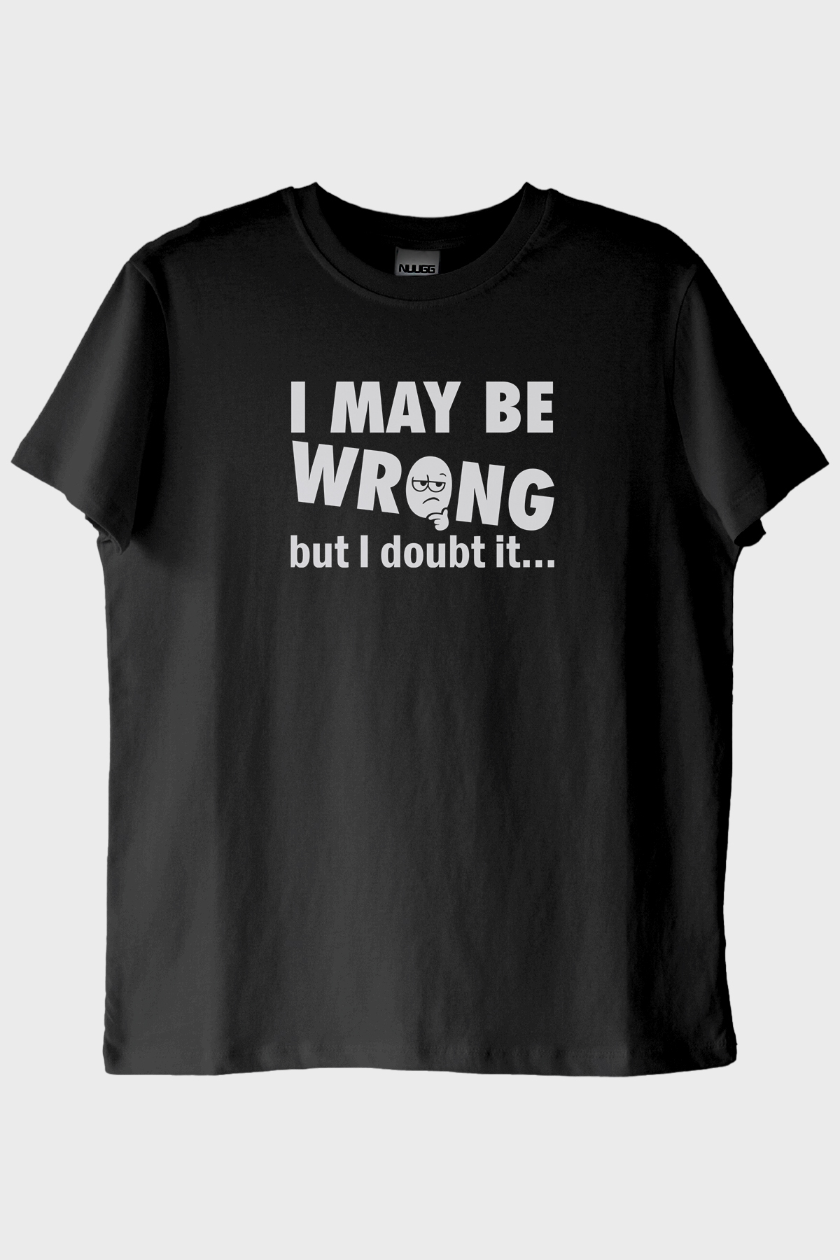 Bu eşsiz T Shirt tasarımı, ön kısmına yerleştirilmiş dikkat çekici ve mizahi bir mesaj sunuyor: "I MAY BE WRONG but I doubt it...". Yazının klasik sans-serif font kullanımı ve kelimelerin farklı boyutlarda yazılması, tasarımın dikkat çekici olmasını sağlıyor. Özellikle "WRONG" kelimesinin büyük harflerle ve geniş bir fontla vurgulanması, tasarıma ekstra bir çekicilik katıyor. Bunun yanında, "O" harfinin yerine gözlüklü ve düşünceli bir yüz ifadesi eklenerek tasarımın mizahi ve eğlenceli yönü ön plana çıkıyor.