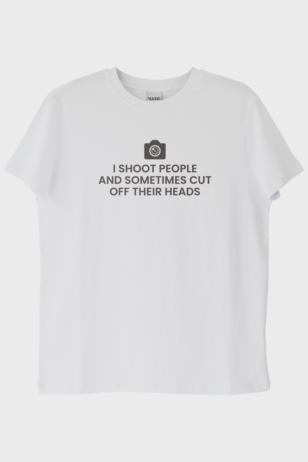tişört, hem kalitesi hem de tasarımı ile dikkat çekiyor. Üzerinde siyah renkte mizahi bir yazı baskısı olan 'I SHOOT PEOPLE AND SOMETIMES CUT OFF THEIR HEADS' ifadesi, fotoğrafçılığın eğlenceli yanlarını simgeliyor. Tasarım, sade beyaz renkte olup üst kısmında bir kamera simgesi yer alır. Bu da ürünün fotoğrafçılıkla ilgili olduğuna vurgu yapmaktadır.