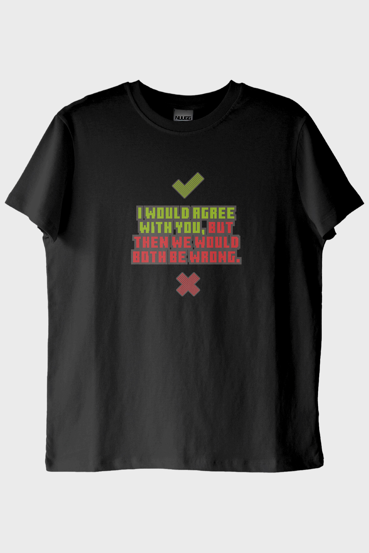 %100 pamuklu kumaştan üretilen bu özel tasarım tişört, güçlü mizahi mesajıyla dikkat çekiyor. Siyah zemin üzerine yerleştirilmiş olan "I would agree with you, but then we would both be wrong" ifadesi, kelime oyunu sevenler için mükemmel bir parça. Tişörtün göğüs kısmında yer alan bu baskı, "I would agree with you" kısmı yeşil renkle, "but then we would both be wrong" ise kırmızı renkle vurgulanmış, böylece eğlenceli bir kontrast yaratılmış. Tasarım,