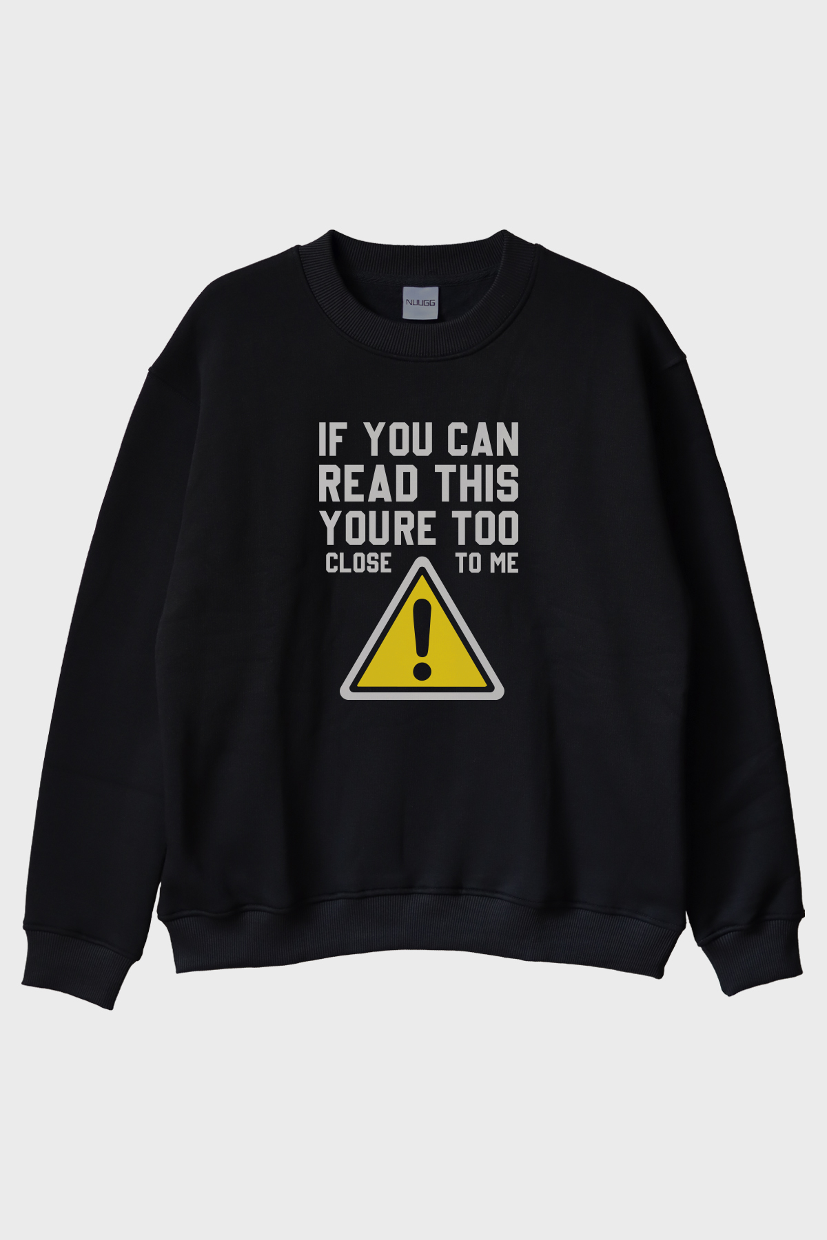 Bu eğlenceli ve dikkat çekici bisiklet yaka sweatshirt tasarımı, giyenlerin tebessüm etmesine ve çevresindekilere takılmasına neden olacak nitelikte. Üzerinde büyük harflerle 'IF YOU CAN READ THIS YOU'RE TOO CLOSE TO ME' mesajı bulunan bu bisiklet yaka sweatshirt, özellikle sosyal mesafe konusuna mizahi açıdan dikkat çekmek isteyenler için eşsiz bir parça. Siyah zemin üzerine beyaz yazıların ön planda olduğu bu tasarım, altındaki sarı üçgen içindeki siyah ünlem sembolüyle tamamlanıyor. Göz alıcı ve kalın sans serif yazı stili, mesajı daha da vurucu bir hale getiriyor.