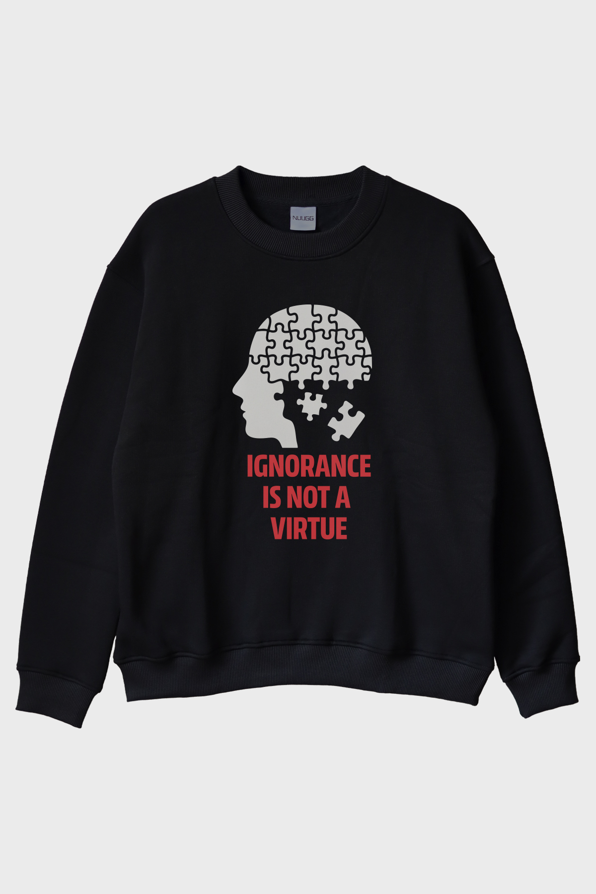 Bilgiye ve öğrenmeye teşvik eden şık bir tasarımla karşınızdayız: “Ignorance Is Not A Virtue”. Siyah zemin üzerine, bir yüz silüeti içinde iki parçalı bir puzzle grafik tasarımına sahip olan bu bisiklet yaka sweatshirt, altındaki kırmızı harflerle yazılan vurgulu cümlesiyle dikkat çekiyor. Beyaz puzzle parçaları ile kırmızı metin göz alıcı bir kontrast yaratılarak, düşünsel bir mesajın cesur bir şekilde vurgulanması sağlanıyor. Bu özel tasarım, bilgi ve bilim meraklılarını hedef alarak özgün bir tarz sunuyor.