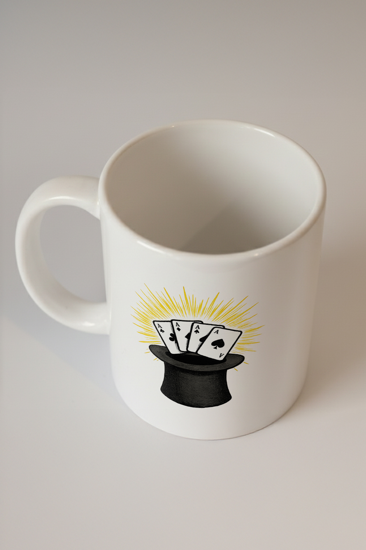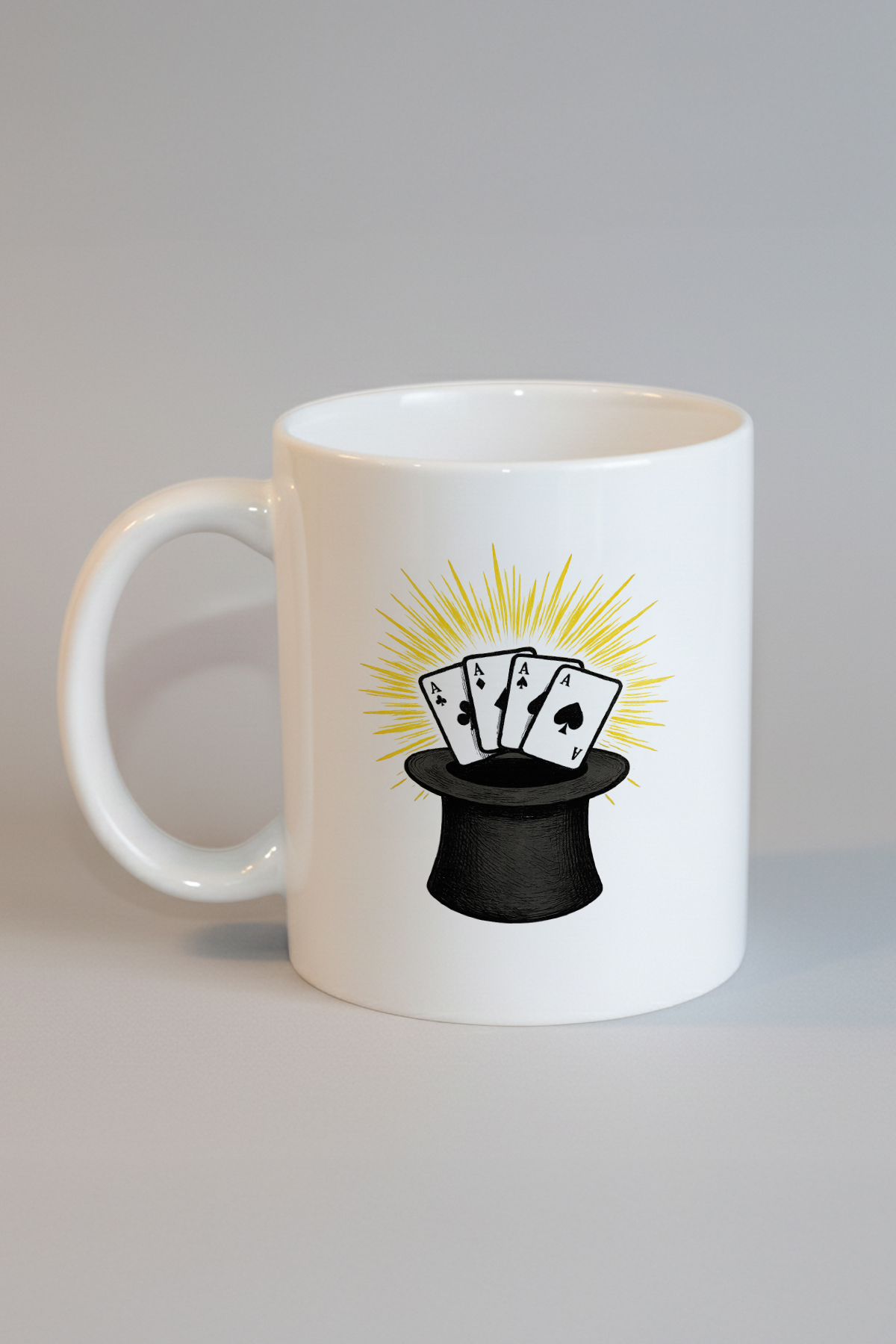 İllüzyon Şapka Kupa, sihirbazlık ve illüzyon sanatlarına ilgi duyanların koleksiyonlarına ilginç ve zarif bir dokunuş kazandıracak şekilde tasarlandı. Tasarımında, klasik siyah bir sihirbaz şapkası yer almakta olup, içinden dört adet iskambil ası zarif bir şekilde fırlarken betimlenmiştir. Bu kartlar, etrafındaki sarı ışınlar ile adeta parıl parıl parlayarak tasarımın merkezinde yer almaktadır. Bu dikkat çekici detaylar, ürünün sıradan bir kupadan çok daha fazlası olduğunun altını çizmektedir. Hayal gücünüzü harekete geçirip, her bir içeceğinizi büyülü bir ritüele dönüştürerek günlük yaşamınıza sihirli bir hava katmaya hazır olun.