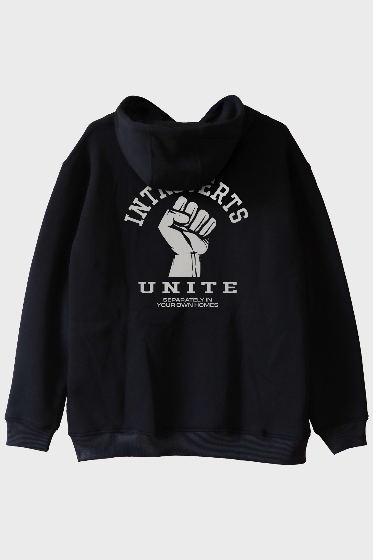Tasarımda, siyah zemin üzerine işlenen beyaz yazılar dikkat çekiyor. Üst kısmında "INTROVERTS UNITE" yazısı yer alırken, merkezde tek bir yumruk baskısı güç ve birlikteliği temsil ediyor. Altında ise "SEPARATELY IN YOUR OWN HOMES" ifadesi, içe dönüklerin kendi alanlarında bir arada olmasını mizahi bir dille betimliyor. Sonuç olarak, zıt renkler ve merkezdeki baskı, mesajın daha belirgin hale gelmesini sağlıyor.