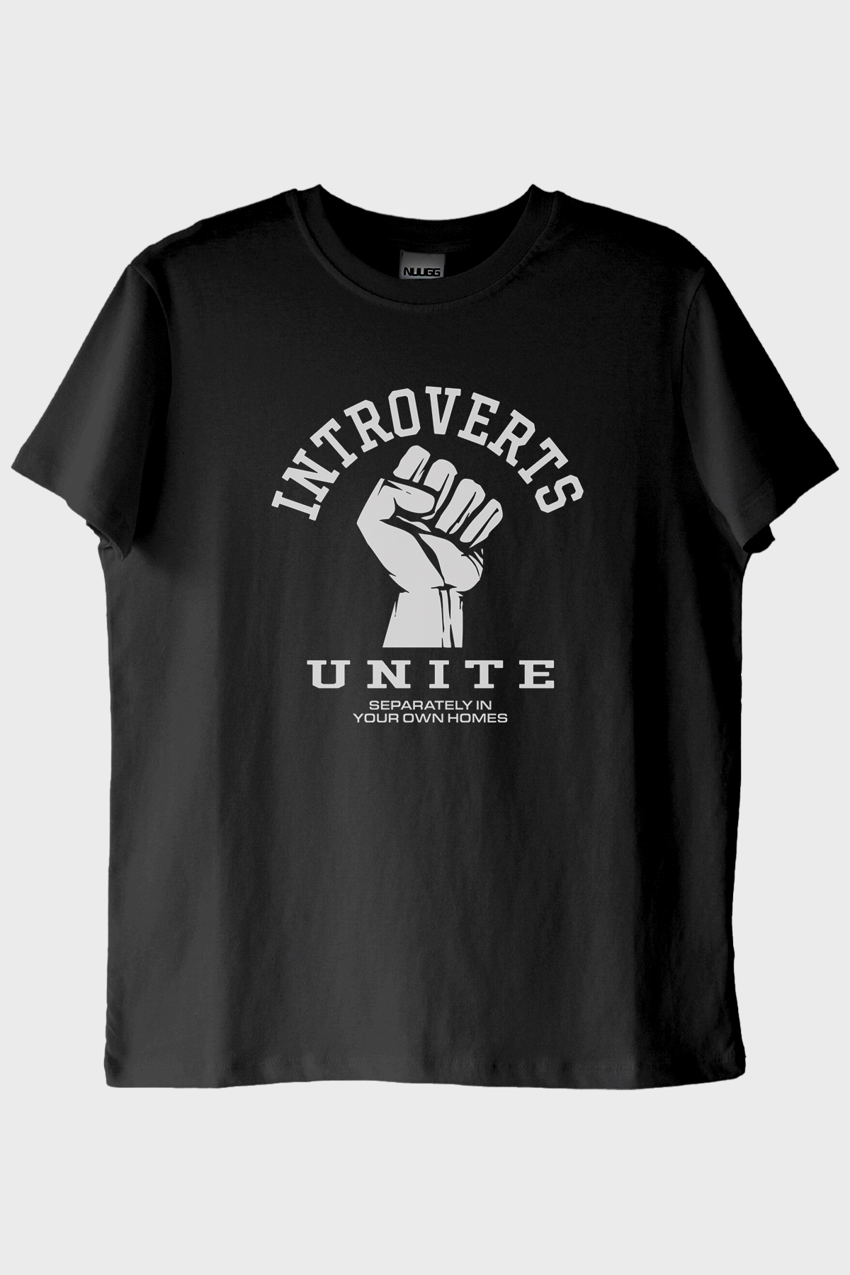 Introverts Unite Baskılı Mizahi Siyah Tişört