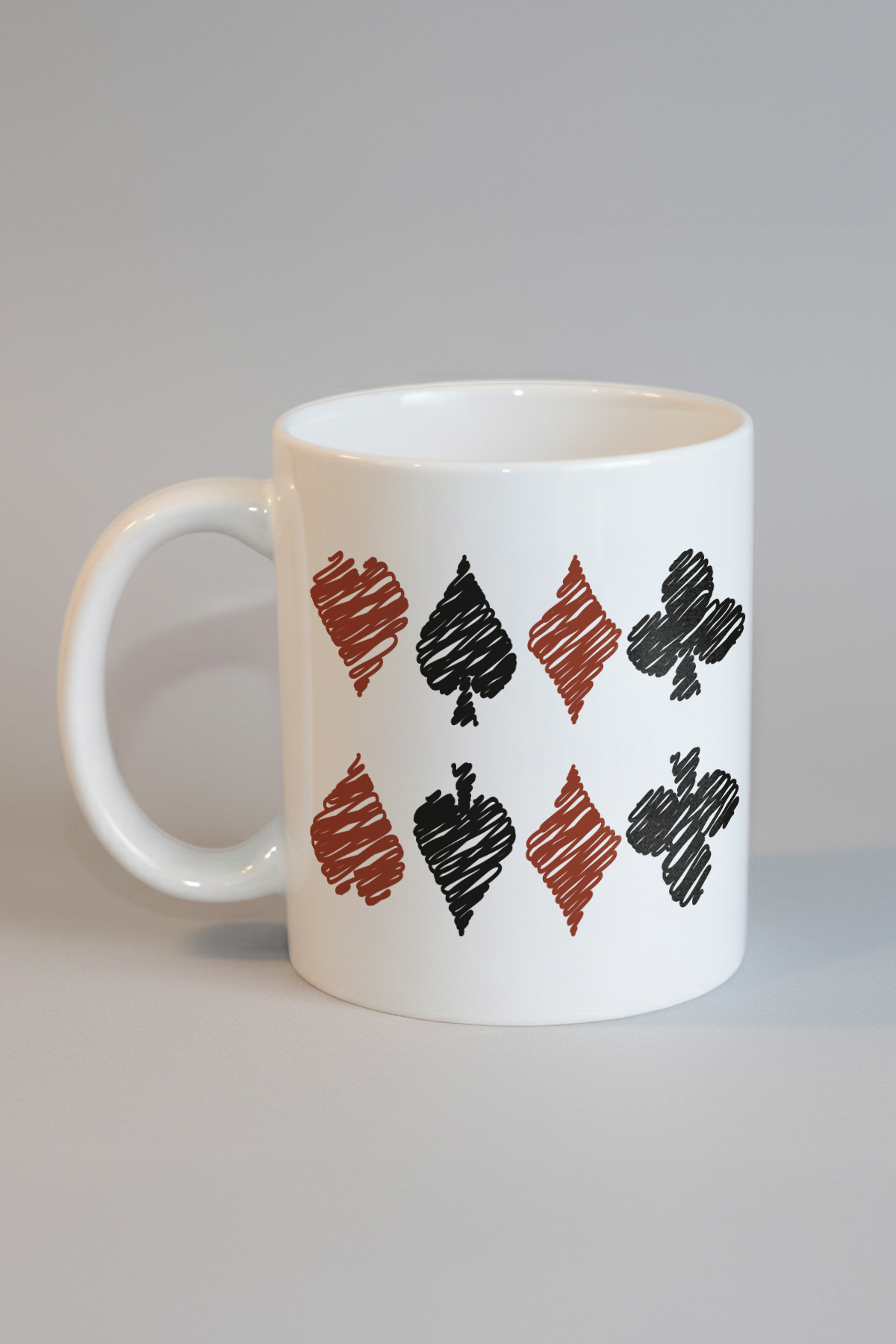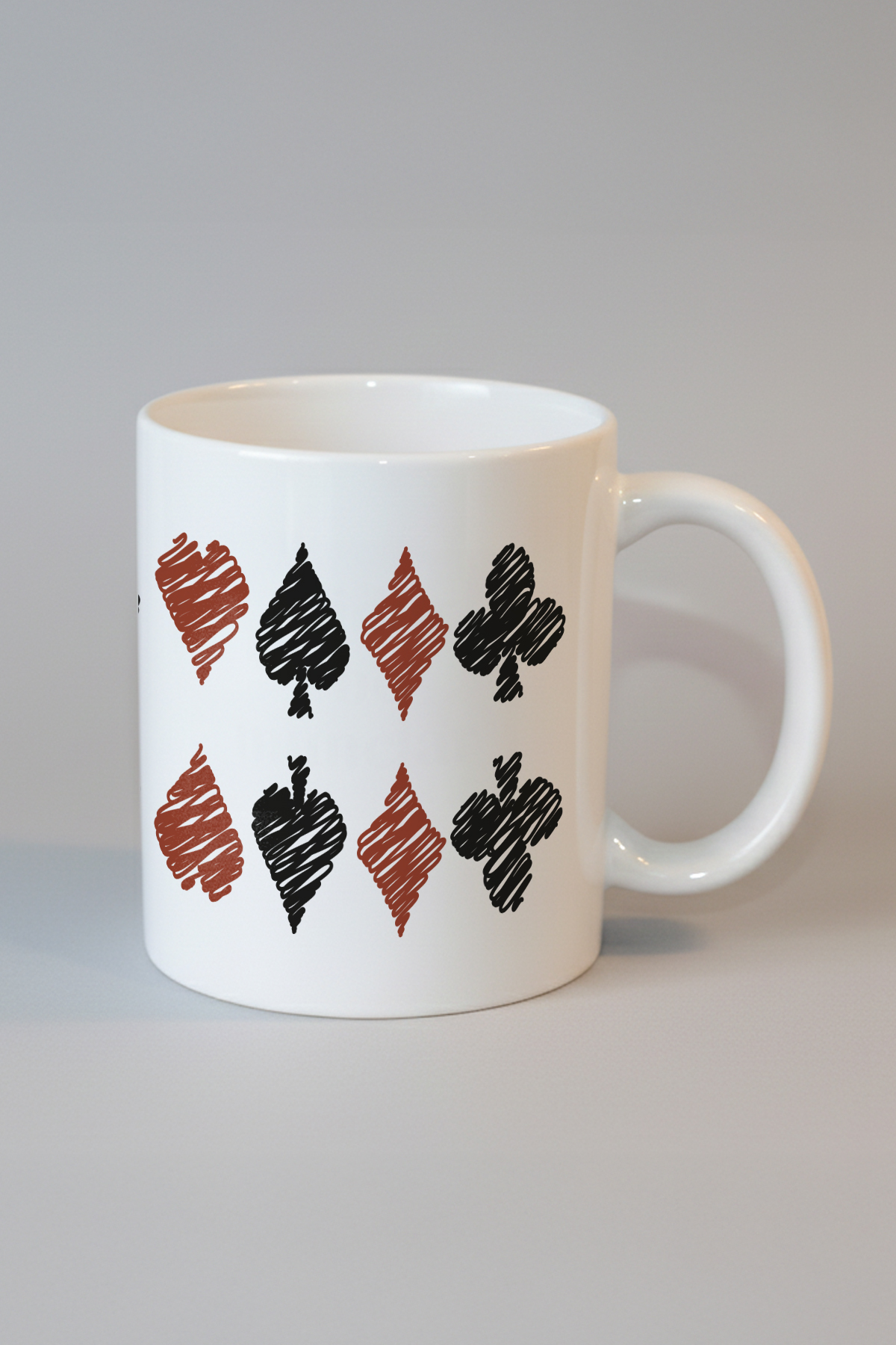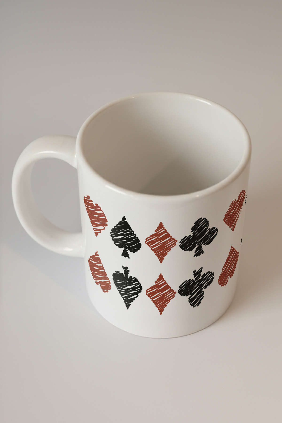 Iskambil kartlarının zarif ve sanatsal tasarımı sayesinde, bu ürün hem işlevsel bir kahve kupası hem de göz alıcı bir dekorasyon parçası olarak öne çıkıyor. Maça, kupa, karo ve sinek gibi dört klasik iskambil sembolü, bu dizaynın merkezinde yer alıyor. Her simge, sanki elle çizilmiş gibi görünerek, tasarımı bir sanat eseri niteliğine taşıyor. Kart oyunları ve klasik tasarımlar tutkunları için ideal bir seçim olan bu ürün, kahve saatlerinizi renklendirirken stilinizi de yansıtacak.