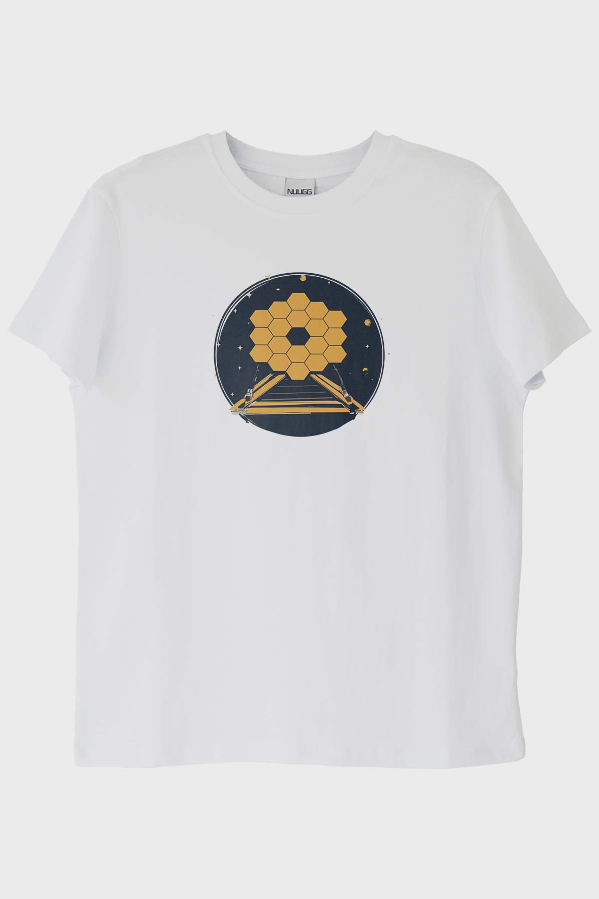 Uzaya ve teknolojiye olan ilginizi gardırobunuza da taşımak ister misiniz? İşte size mükemmel bir fırsat! Beyaz zemin üzerine dizayn edilmiş bu etkileyici James Webb Teleskopu Tasarımlı Gökbilim Baskılı Tişört, gökbilim temalı modern tasarımıyla dikkat çeker. Tişörtün ön kısmında yer alan yuvarlak desen, gece gökyüzünün derinliğini ve gizemini simgeler. Altıgen şekillerle oluşturulmuş çekirdek yapı, altın ve koyu mavi tonlarıyla zengin bir görünüm sunarak uzay ve teknoloji hissiyatını pekiştirir.