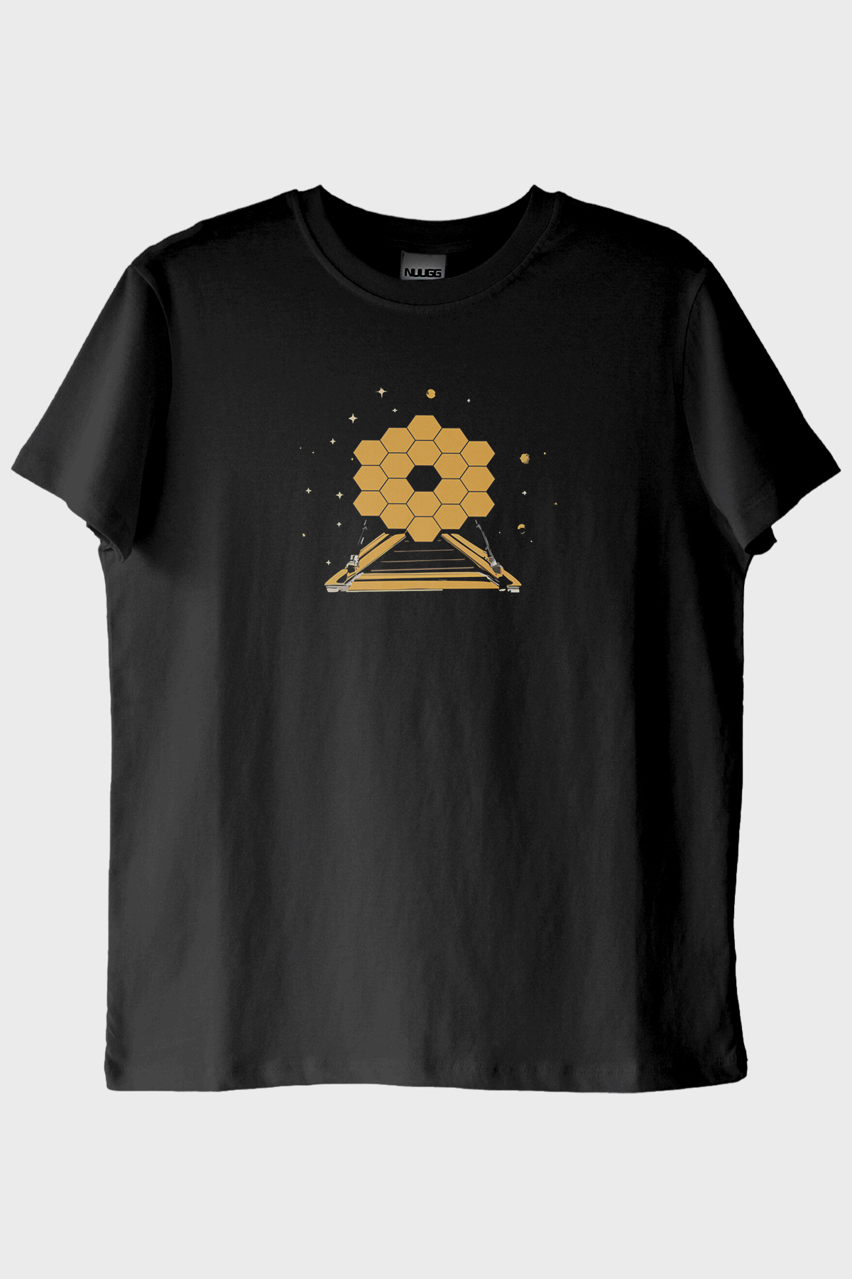 Uzaya ve teknolojiye olan ilginizi gardırobunuza da taşımak ister misiniz? İşte size mükemmel bir fırsat! Beyaz zemin üzerine dizayn edilmiş bu etkileyici James Webb Teleskopu Tasarımlı Gökbilim Baskılı Tişört, gökbilim temalı modern tasarımıyla dikkat çeker. Tişörtün ön kısmında yer alan yuvarlak desen, gece gökyüzünün derinliğini ve gizemini simgeler. Altıgen şekillerle oluşturulmuş çekirdek yapı, altın ve koyu mavi tonlarıyla zengin bir görünüm sunarak uzay ve teknoloji hissiyatını pekiştirir.