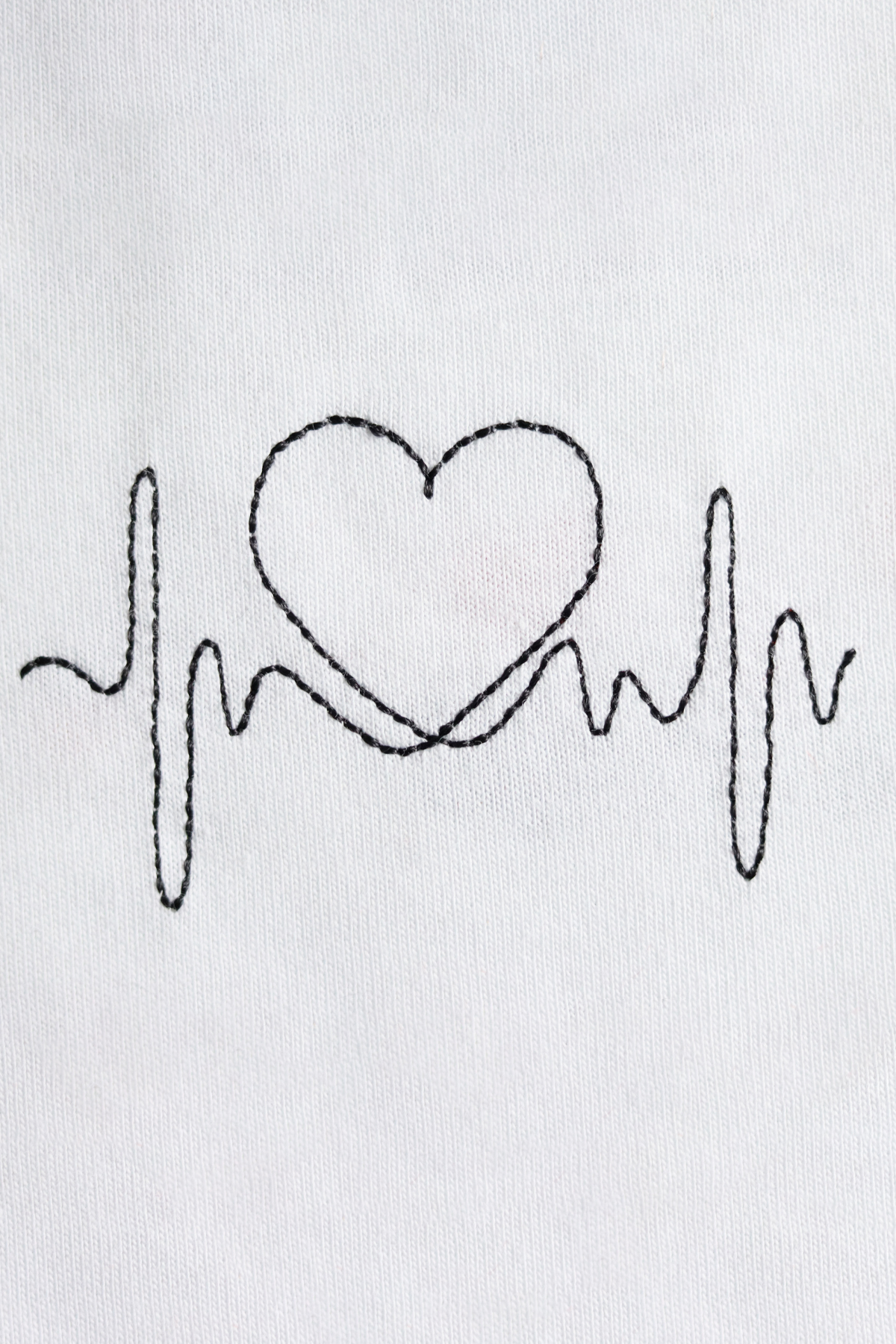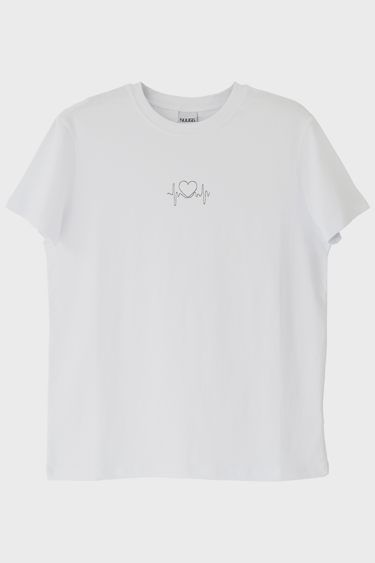 %100 pamuk kumaştan üretilen bu tişört, rahat ve nefes alabilir bir yapıya sahip olup, uzun süre dayanıklı ve konforludur. Kumaşının yumuşak dokusu sayesinde gün boyu rahat bir kullanım sunar. Kalp atışı deseni ve ortadaki kalp işçiliği ise tişörtün her yönüyle zarif bir görünüm kazanmasını sağlar. Sade ve şık tasarımı, Sevgililer Günü ve diğer özel günler için harika bir hediye alternatifi oluşturur.
